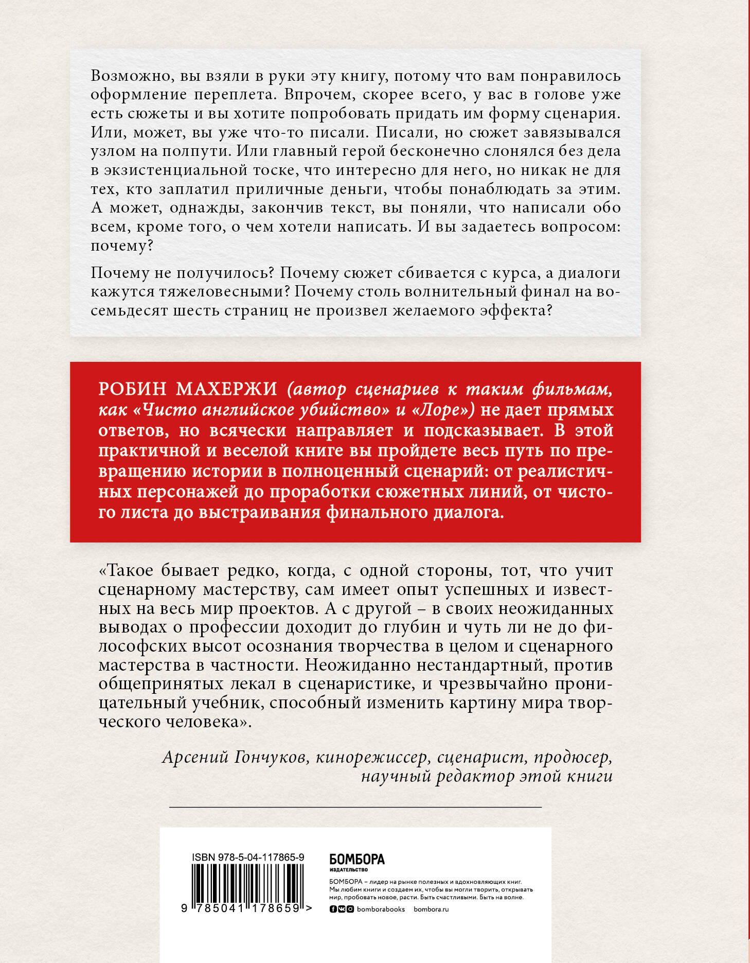 От умения рассказать интересную историю до умения написать полноценный сценарий, который заинтересует зрителей и продюсеров, лежит путь, описанный в этой книге. Автор Робин Махержи («Чисто английское убийство», «Медики», «Жители Ист-Энда», «Катастрофа», «Лоре») не только расскажет о секретах профессии, но и покажет «закулисье» жизни сценариста. - Как не запутаться в сюжетных линиях при работе с составными нарративами? - Зачем нужны вертикальные конструкции и как их правильно выстраивать? - Как «написать тишину» и как сделать диалоги более живыми? - Как раскрыть персонажа, не используя прямых описаний? - Почему четкие конструкции не делают фильм скучным, а, наоборот, придают ему динамику? Махержи дает бесценные практические советы из своего опыта работы сценаристом. А все его выводы и задания подкреплены примерами из мировой поп-культуры: от «12 ночи» Шекспира до «Железного человека». «Такое бывает редко, когда с одной стороны тот, что учит сценарному мастерству, сам имеет опыт успешных и известных на весь мир проектов. А с другой, в своих неожиданных выводах о профессии доходит до глубин и чуть ли не до философских высот осознания творчества в целом и сценарного мастерства в частности. Неожиданно нестандартный, против общепринятых лекал в сценаристике, и чрезвычайно проницательный учебник, способный изменить картину мира творческого человека». - Арсений Гончуков, кинорежиссер, сценарист, продюсер, научный редактор этой книги Эта книга доказывает, что хорошие навыки сторителлинга легко трансформируются в дело всей жизни.