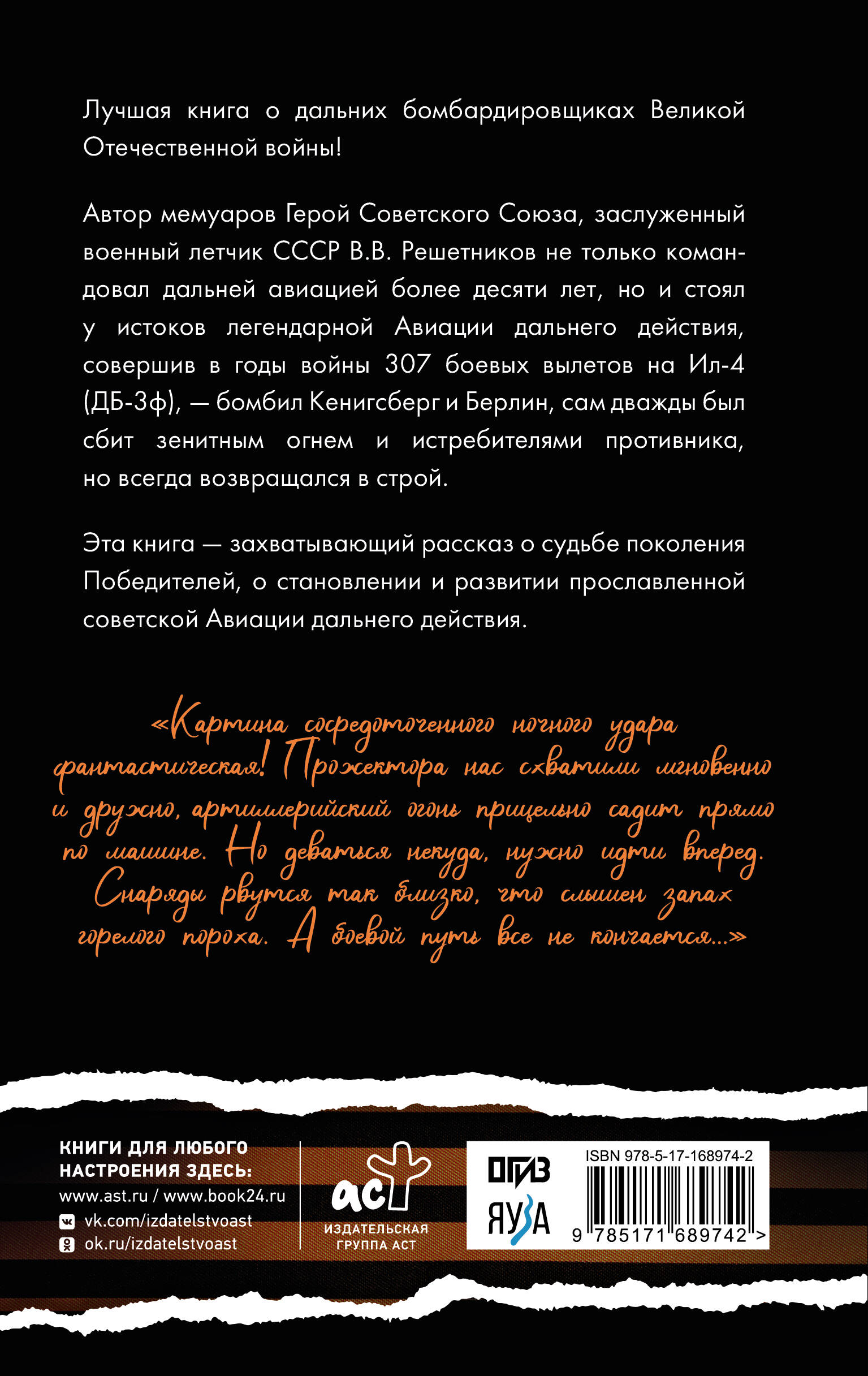 Лучшая книга о дальних бомбардировщиках Великой Отечественной войны! Автор мемуаров, Герой Советского Союза, заслуженный военный летчик СССР В.В. Решетников не только командовал дальней авиацией более десяти лет, но и стоял у истоков легендарной Авиации дальнего действия, совершив в годы войны 307 боевых вылетов на Ил-4 (ДБ-3ф), - бомбил Кенигсберг и Берлин, сам дважды был сбит зенитным огнем и истребителями противника, но всегда возвращался в строй. Эта книга - захватывающий рассказ о судьбе поколения Победителей, о становлении и развитии прославленной советской Авиации дальнего действия.