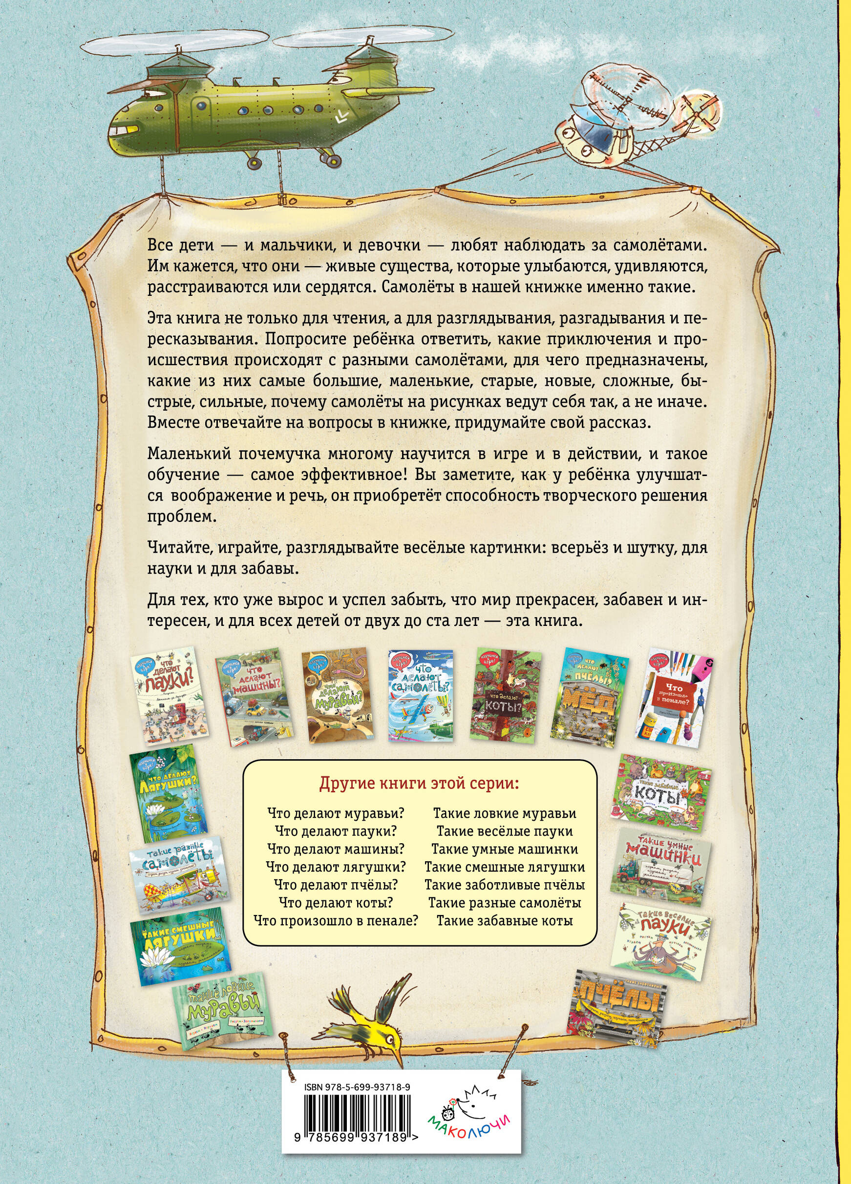 Все дети - и мальчики, и девочки - любят наблюдать за самолётами. Им кажется, что они - живые существа, которые улыбаются, удивляются, расстраиваются или сердятся. Самолёты в нашей книжке именно такие. Эта книга не только для чтения, а для разглядывания, разгадывания и пересказывания. Попросите ребёнка ответить, какие приключения и происшествия происходят с разными самолётами, для чего предназначены, какие из них самые большие, маленькие, старые, новые, сложные, быстрые, сильные, почему самолёты на рисунках ведут себя так, а не иначе. Вместе отвечайте на вопросы в книжке, придумайте свой рассказ. Маленький почемучка многому научится в игре и в действии, и такое обучение - самое эффективное! Вы заметите, как у ребенка улучшатся воображение и речь, он приобретет способность творческого решения проблем. Читайте, играйте, разглядывайте весёлые картинки: всерьёз и в шутку, для науки и для забавы. Для тех, кто уже вырос и успел забыть, что мир прекрасен, забавен и интересен, и для всех детей от двух до ста лет - эта книга.| Издательство | ООО "Издательство "Эксмо" |