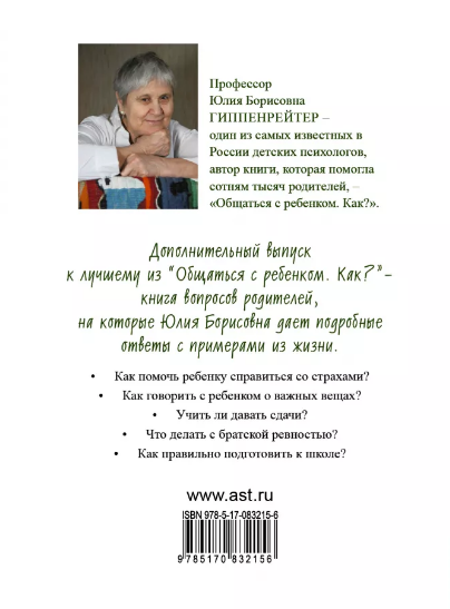 В дополнительном выпуске серии "Лучшее из "Общаться с ребенком. Как?"" Юлия Борисовна Гиппенрейтер отвечает на самые острые и актуальные вопросы родителей и на конкретных диалогах показывает, как разговаривать с детьми, чтобы поддерживать с ними доверительные отношения. Огромный практический опыт автора, реальные случаи из жизни, живые и выразительные иллюстрации делают эту книгу незаменимым помощником для всех мам и пап.