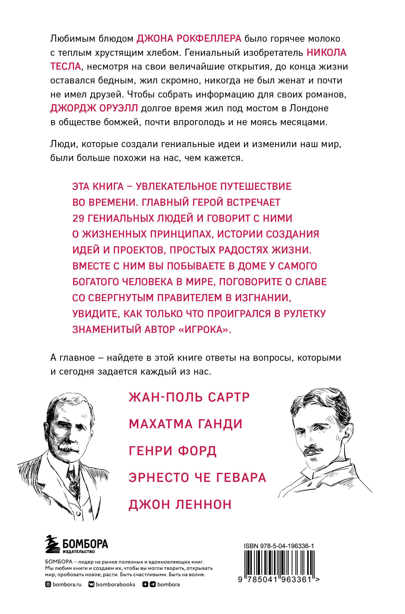 Чтобы расширить свой кругозор и понять окружающий мир, важно знать идеи, которые лежат в его основе. Но мало кто сможет найти достаточно времени, чтобы читать автобиографии гениальных людей. Эта книга - увлекательное путешествие во времени. Главный герой встречает 29 гениальных людей, чьи идеи и творчество изменили мир. Никола Тесла, Стив Джобс, Джон Леннон, Джон Рокфеллер и другие - автор говорит с ними о жизненных принципах, истории создания идей и проектов и простых радостях жизни. Вместе с автором вы побываете в доме у самого богатого человека в мире, поговорите о славе со свергнутым правителем в изгнании, увидите, как только что проигрался в рулетку знаменитый автор «Игрока». А главное - найдете в этой книге ответы на вопросы, которыми и сегодня задается каждый из нас.| Издательство | ООО "Издательство "Эксмо" |