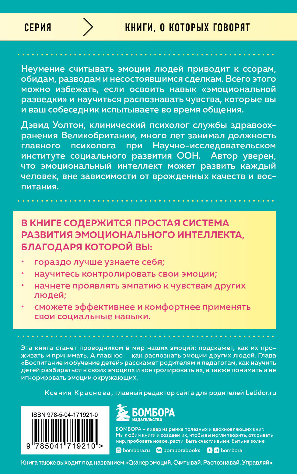 Об эмоциональном интеллекте написаны сотни самых разных книг - каждая в своей манере, в зависимости от интересов или академической специализации авторов. Концепция EI стала одной из самых обсуждаемых идей в популярной психологии, учебно-производственном процессе, в области управления, образования и социального обеспечения. В каждой главе этой книги вам будут встречаться моменты, которые нужно запомнить, практические упражнения и полезные заметки. В рамках введения мы исследуем основы, на которых базируется эмоциональный интеллект, включая общее понимание EI, причины движущих нами эмоций и их связь с системой управления нашим мозгом. Мы также узнаем, почему истинно английская выдержка является противоположностью эмоционального интеллекта, и разберем, почему жесткость и «крутость» так долго ценились в обществе. Развивая эмоциональный интеллект, вы: • гораздо лучше узнаете себя; • научитесь контролировать свои эмоции; • начнете проявлять эмпатию к чувствам других людей; • сможете эффективнее и радостнее применять свои социальные навыки. ОБ АВТОРЕ Дэвид Уолтон работал клиническим психологом Государственной службы здравоохранения Великобритании, занимался организационной психологией в государственных и частных компаниях, был ведущим консультантом Великобритании и Северной Америки по поведенческим наукам и ведущим психологом Научно-исследовательского института социального развития Организации Объединенных Наций. За годы своей карьеры Дэвид успел потрудиться в Еврокомиссии на должности консультанта по вопросам управления и развития персонала, поработать с частными и государственными компаниями в качестве консультанта по вопросам кадрового и организационного развития, взять под свое крыло два студенческих братства британских ВУЗов. Дэвид является национальным наставником двух весьма крупных благотворительных организаций. А еще он разрабатывает образовательные программы, с помощью которых хочет помочь всем желающим разобраться в вопросах психического здоровья, узнать о методах когнитивной терапии, борьбы с депрессией и особенностях развития детей и подростков. ЦИТАТЫ: «Вам не нужно быть психологом, чтобы понять концепцию эмоционального интеллекта. Важной частью этого процесса является осознание того, что наш мозг запрограммирован на эмоции и у каждой эмоции есть цель». «Наше прошлое и представление о себе во многом определяют, как мы интерпретируем поведение других людей, как мы действуем, какое влияние будем оказывать на окружающих». «Низкая самооценка и неуверенность тесно связаны с настроением и представлением о себе, поэтому важно понимать, что убеждения - это мнения, но не факты». «Если вы честны с самим собой и со своим чувством предназначения, другие люди тоже сочтут вас честными и будут вам доверять, даже если им и не нравится то, что вы делаете». «Практикуйте открытость, осознавая, как на вас влияют чувства. Признавайте их. Если необходимо, ясно и твердо дайте другому человеку понять, что его комментарий или поведение неприемлемо для вас». Книга также выходит под названием "Сканер эмоций. Считывай. Распознавай. Управляй"| Издательство | ООО "Издательство "Эксмо" |