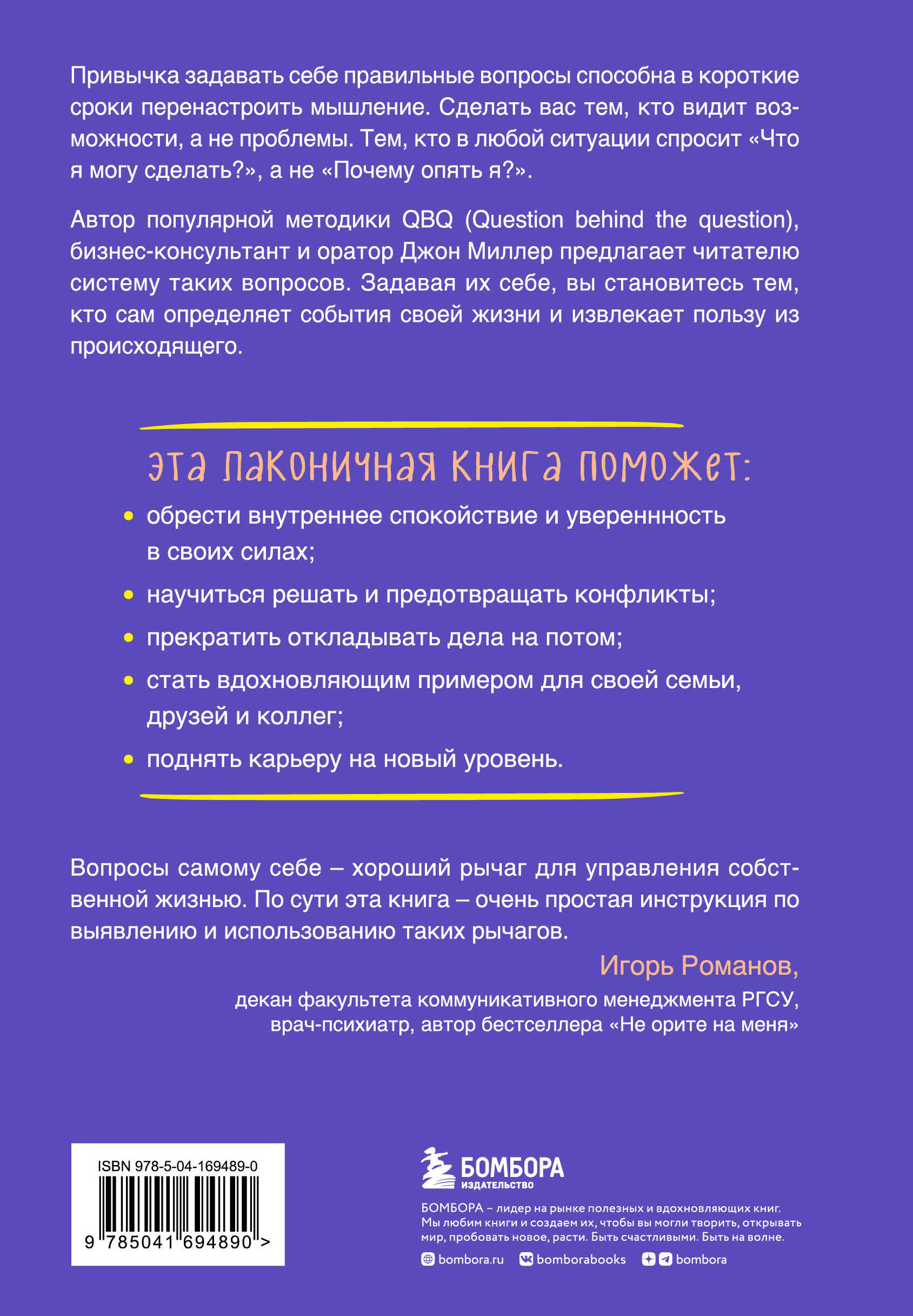 Можно посвятить несколько лет психотерапии и постепенно избавиться от личностных ограничений. А можно прочитать эту книгу, научиться задавать себе правильные вопросы и таким образом навсегда перенастроить мышление. Стать тем, кто видит возможности, а не проблемы. Тем, кто в любой ситуации спросит «Что я могу сделать?», а не «Почему опять я?». Автор популярной методики QBQ (Question behind the question), бизнес-консультант и оратор Джон Миллер уверен: прокачанная личная ответственность - универсальная отмычка, открывающая любые двери, и необходимое условие счастливой жизни. Эта лаконичная прикладная книга помогает: • Улучшить свои навыки коммуникации. • Научиться решать и предотвращать конфликты. • Прекратить откладывать дела на потом. • Избавиться от стресса. • Стать вдохновляющим лидером для своей семьи, друзей и коллег. • Поднять свою карьеру на новый уровень. И, конечно, научиться получать удовольствие от каждого дня!| Издательство | ООО "Издательство "Эксмо" |