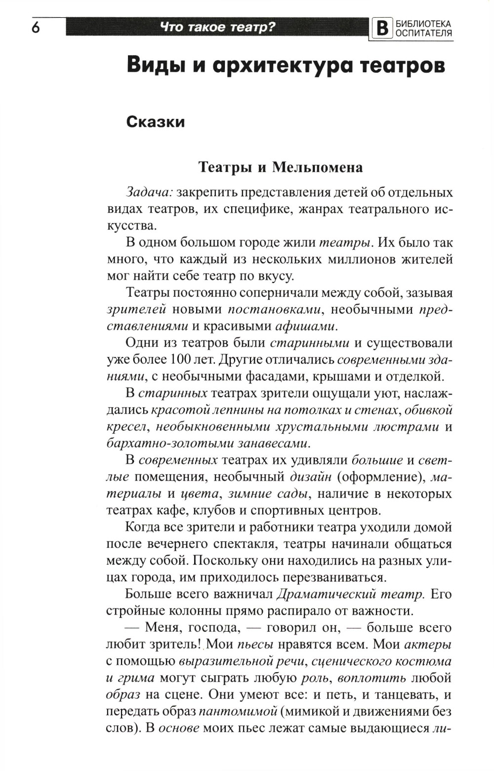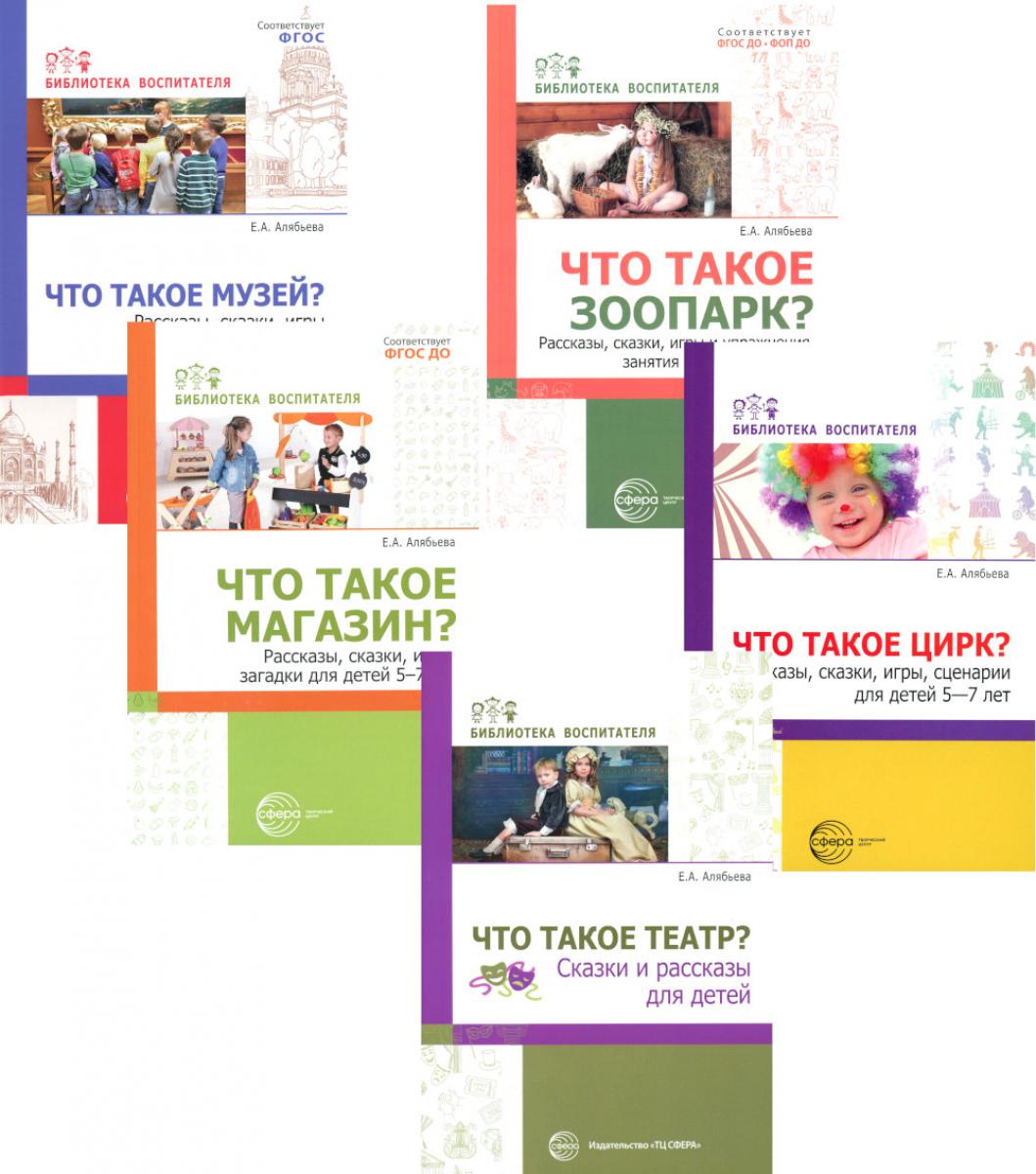 Комплект содержит книги. «Что такое театр? Сказки и рассказы для детей» В книге представлены авторские сказки и рассказы о театре и театральном искусстве для детей 5-8 лет. Они дают возможность значительно расширить знания о разных видах театров, особенностях их архитектуры, внутреннего наполнения, специфике деятельности разных работников театра, значимости их работы, своеобразии игры актеров, занимающихся разными видами театрального искусства. Выход автора за пределы российских театров расширяет представления детей о мире. Содержание сказок и рассказов соответствует требованиям современных дошкольных образовательных программ. «Что такое музей? Рассказы, сказки, игры для детей 5-8 лет» книге представлены авторские сказки и рассказы о музеях разных стран мира для детей 5-8 лет. Они дают возможность значительно расширить знания детей о музеях, архитектуре их зданий, типах музеев, разнообразии экспозиций, специфике и значимости деятельности работников музея. Выход автора за пределы российских музеев расширяет представления детей о мире. Содержание сказок и рассказов соответствует требованиям современных дошкольных образовательных программ. Методическое обеспечение поможет педагогам и родителям организовать беседу и разные виды детской деятельности по теме. Оно дает взрослым возможность выбора содержания и объема предлагаемого детям материала. «Что такое магазин? Рассказы, сказки, игры, загадки для детей 5-7 лет» В книге представлены авторские рассказы, сказки и стихи о магазинах для детей 5-7 лет. Они дают возможность расширить знания детей о видах магазинов, их особенностях, самых знаменитых, самых необычных и старинных магазинах мира, работниках магазинов и сотрудничающих с ними структур. Содержание произведений соответствует требованиям современных образовательных программ. Методическое обеспечение поможет педагогам и родителям организовать беседу и разные виды практической деятельности по теме. Оно дает взрослым возможность выбора содержания и объема предлагаемого детям материала. «Что такое зоопарк? Рассказы, сказки, игры и упражнения, занятия для детей 5-7 лет» В книге представлены авторские сказки и рассказы о зоопарках, океанариумах и национальных парках для детей 5-7 лет. Они дают возможность значительно расширить знания детей о видах данных учреждений и природных территорий, об их значении для сохранения редких видов животных, особенностях устройства, внутреннего наполнения, а также о специфике деятельности разных работников, значимости их работы. Выход автора за пределы российских зоопарков расширяет представления детей о мире. Методическое обеспечение каждого произведения поможет педагогам и родителям организовать беседу и разные виды детской деятельности по теме. Оно дает взрослым возможность выбора содержания и объема предлагаемого детям материала. Загадки, пальчиковые игры, физкультминутки, рекомендации, тематическая гимнастика, конспекты игр и занятий, дидактические упражнения позволят педагогам использовать материал в качестве комплекса и основы для тематического планирования. «Что такое цирк? Рассказы, сказки, игры, сценарии для детей 5-7 лет» В книге представлены авторские сказки, рассказы и стихи о цирке и цирковом искусстве для детей 5-7 лет. Они дают возможность значительно расш