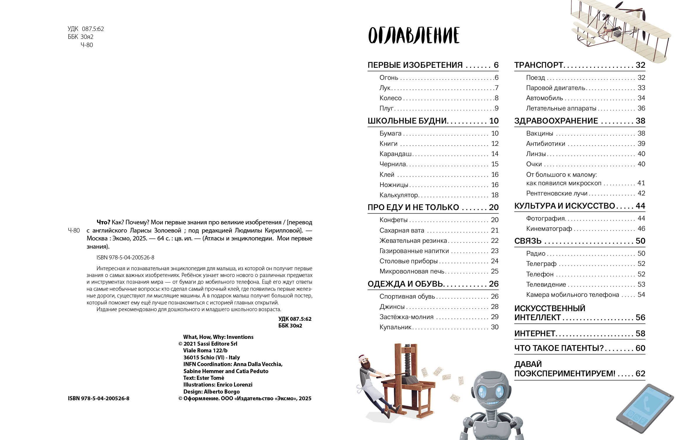 Энциклопедия в формате вопросов и ответов, созданная специально для малышей дошкольного возраста. Вместо длинных статей «научным» языком - наглядные, понятные и увлекательные рассказы о главных изобретениях плюс большой постер в подарок. Удивительные научные открытия, истории создания различных предметов и инструментов познания мира, от колеса до искусственного интеллекта, - всё, что хочется знать маленькому почемучке и о чём он так любит спрашивать! Книга предназначена для совместного семейного досуга и пробуждает интерес ребёнка к самостоятельному чтению.| Издательство | ООО "Издательство "Эксмо" |