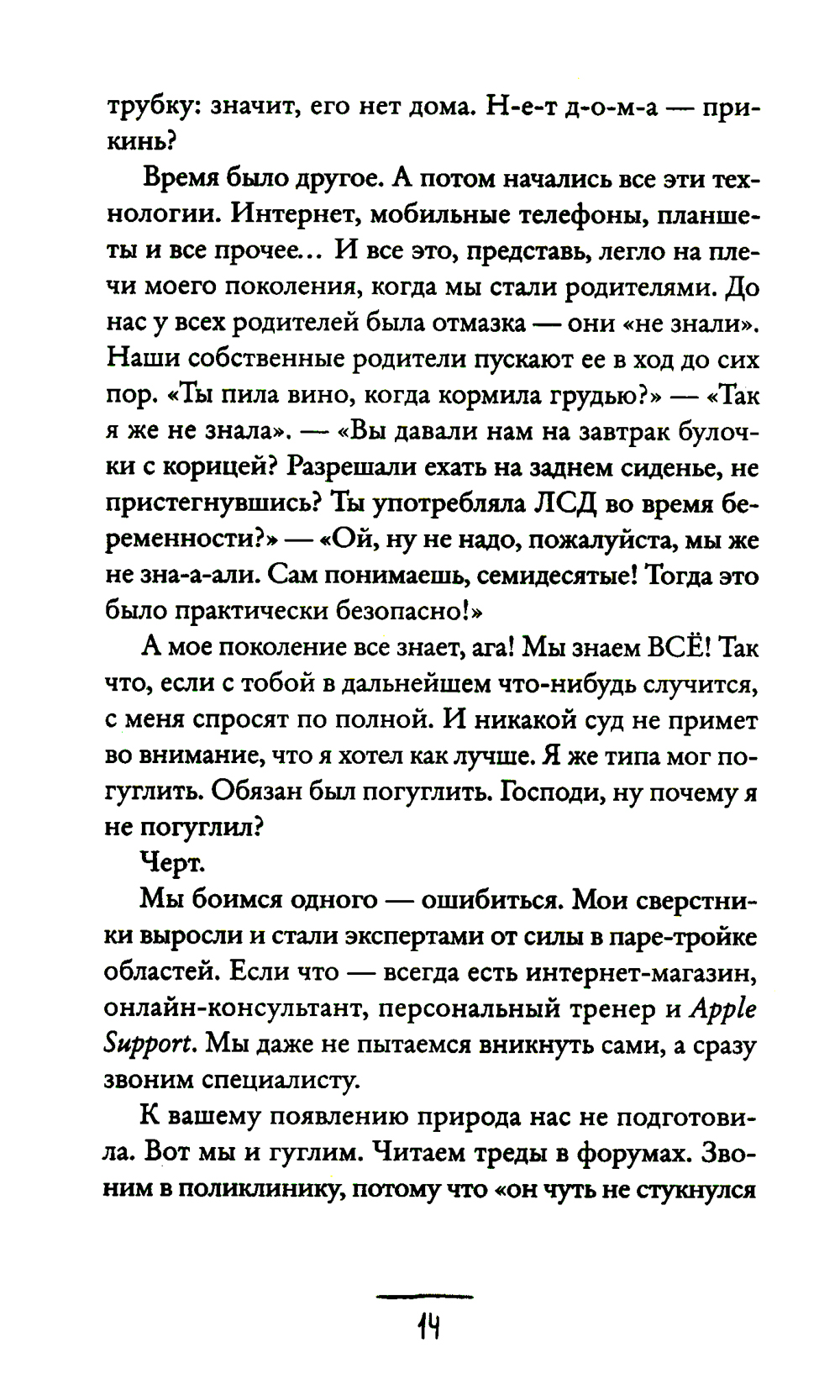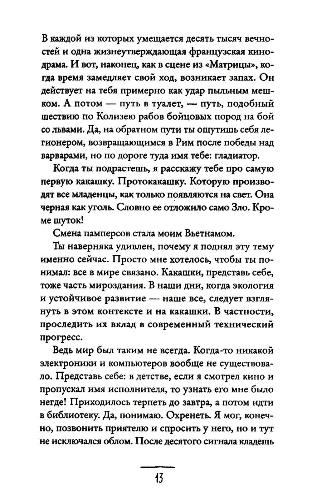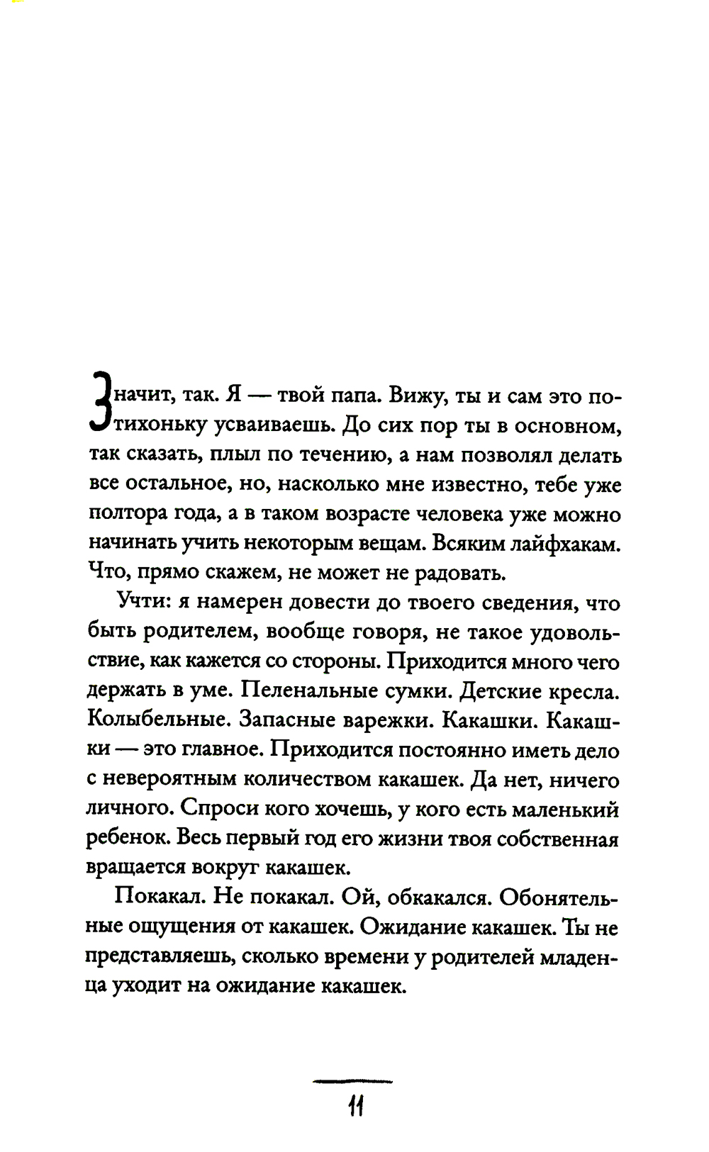 Фредрик Бакман определяет жанр этой книги как «расширенный блог» - она действительно напоминает онлайн-дневник или серию постов в ЖЖ. Обращаясь к своему маленькому сыну, автор рассуждает о самых разных предметах - от футбола до «Икеи», от компьютерных игр до категорий добра и зла. И попутно делится первым, порой комичным, опытом отцовства - с той уникальной чисто бакмановской смесью иронии и нежности, которая принесла ему любовь миллионов читателей. Это не только разговор на равных с крохотным существом, которому еще предстоит вырасти в личность, но и честный разговор с самим собой, попытка осмыслить свою ответственность за происходящее в мире.| Издательство | Синдбад |