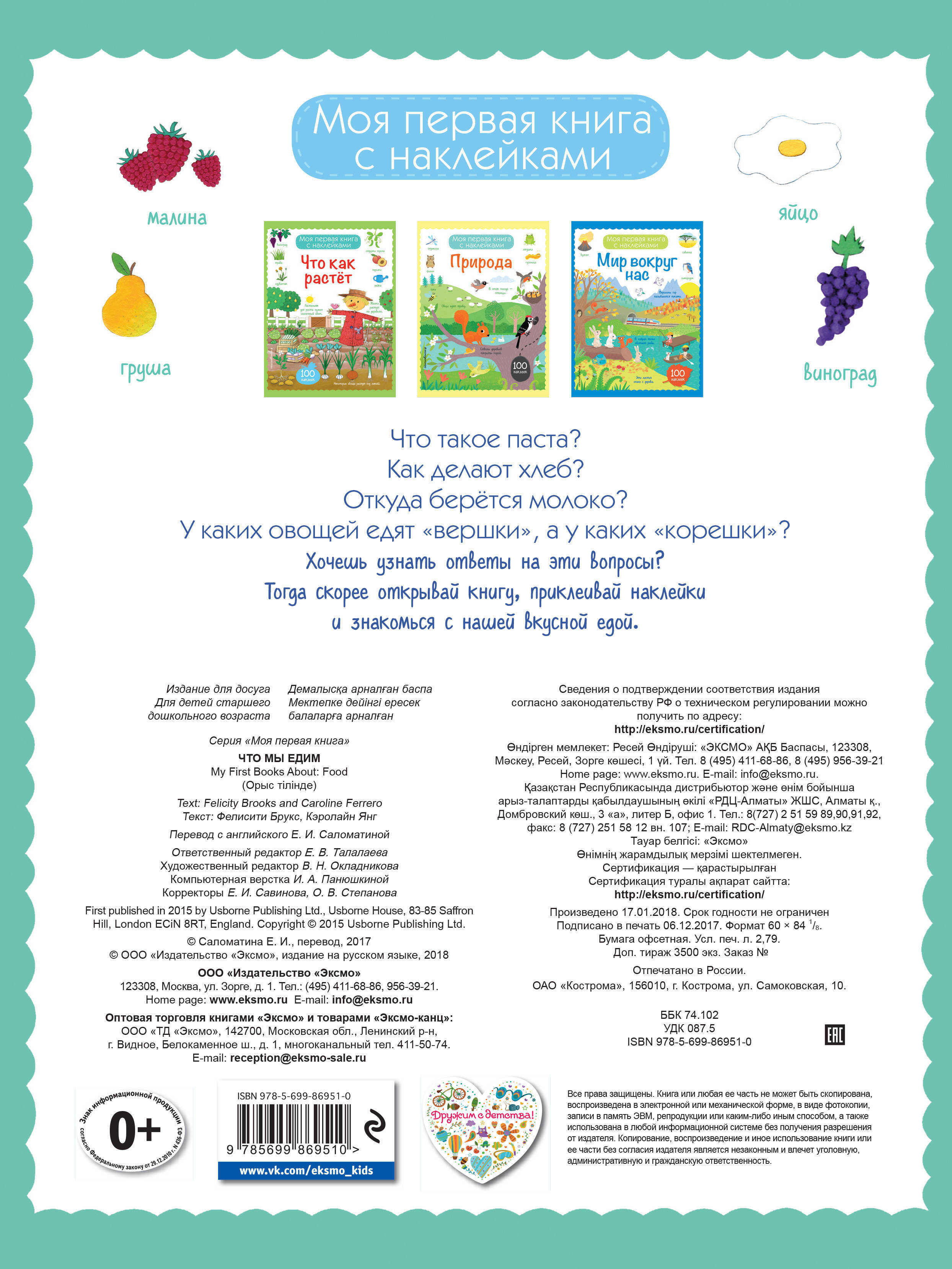 Книга "Что мы едим" - это замечательная возможность для детей не только познакомиться с окружающим миром и узнать, что такое паста, как делают хлеб, откуда берётся молоко, у каких овощей едят «вершки», а у каких «корешки»,но и весело провести время, приклеивая наклейки (а их в книге более 100!). Эти наклейки специально предназначены для маленьких ручек - они не имеют острых углов. Дети не будут испытывать трудность с их приклеиванием.| Издательство | ООО "Издательство "Эксмо" |
