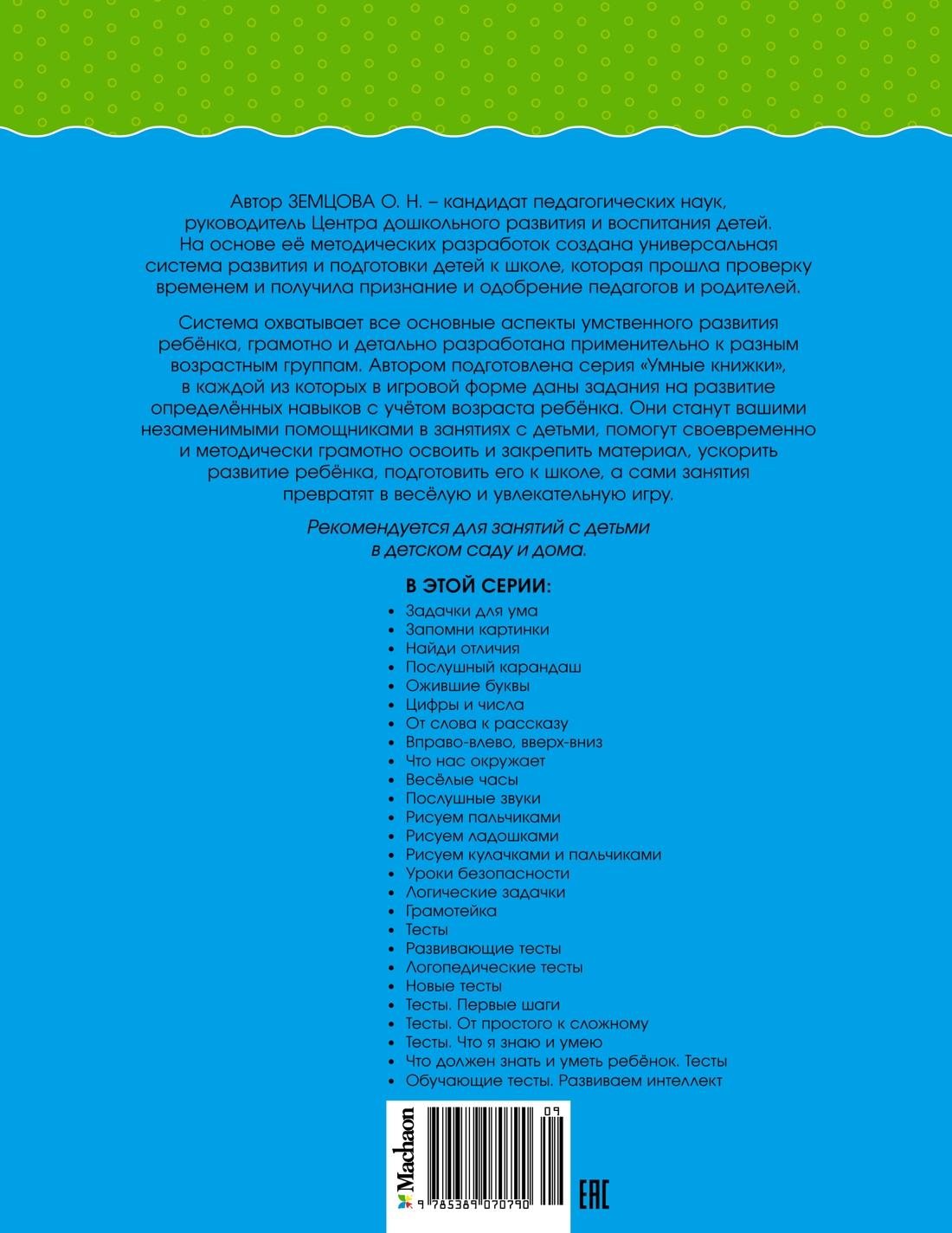 Автор книг этой серии - Земцова Ольга Николаевна, кандидат педагогических наук, руководитель Центра дошкольного развития и воспитания детей. Цель разработанной автором методики - комплексное развитие ребёнка с учётом требований современного дошкольного образования. Методика О. Н. Земцовой формирует у детей не только систему знаний, но и позитивное отношение к учёбе, уверенность в своих силах и нацеленность на результат. В этой серии вы найдёте книги с тестовыми заданиями трёх уровней сложности для разных возрастных групп. Занимаясь по книгам, вы сможете проверить знания вашего ребёнка и узнаете, какие навыки требуют дополнительного развития. Рекомендуется для занятий с детьми в детском саду и дома.| Издательство | Махаон |