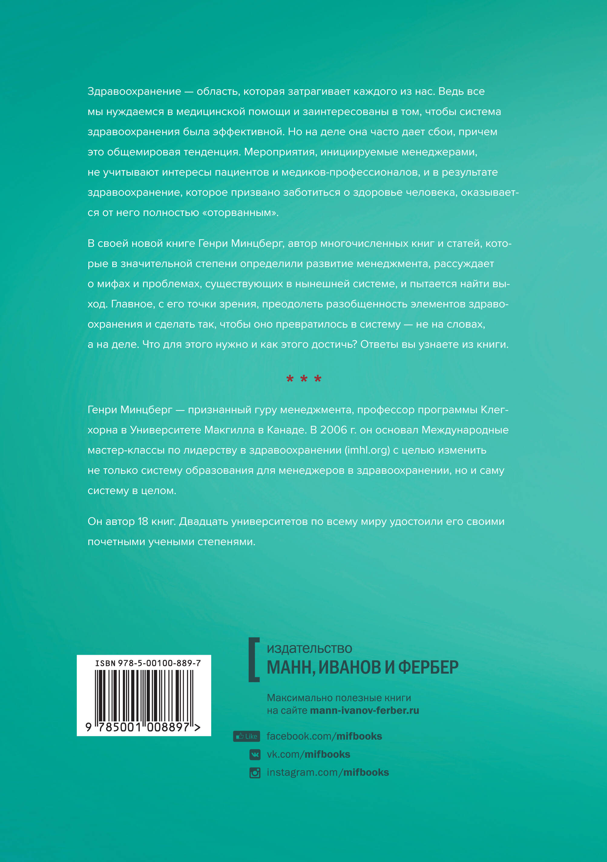 Генри Минцберг, известный автор бизнес-книг, профессор менеджмента, анализирует проблемы системы здравоохранения, главная из которых - разобщенность ее элементов (здоровье, общество, лечение и уход). В книге нет национальной специфики, проблемы, которые описывает автор, характерны для многих государств.| Издательство | МАНН, ИВАНОВ И ФЕРБЕР ООО |