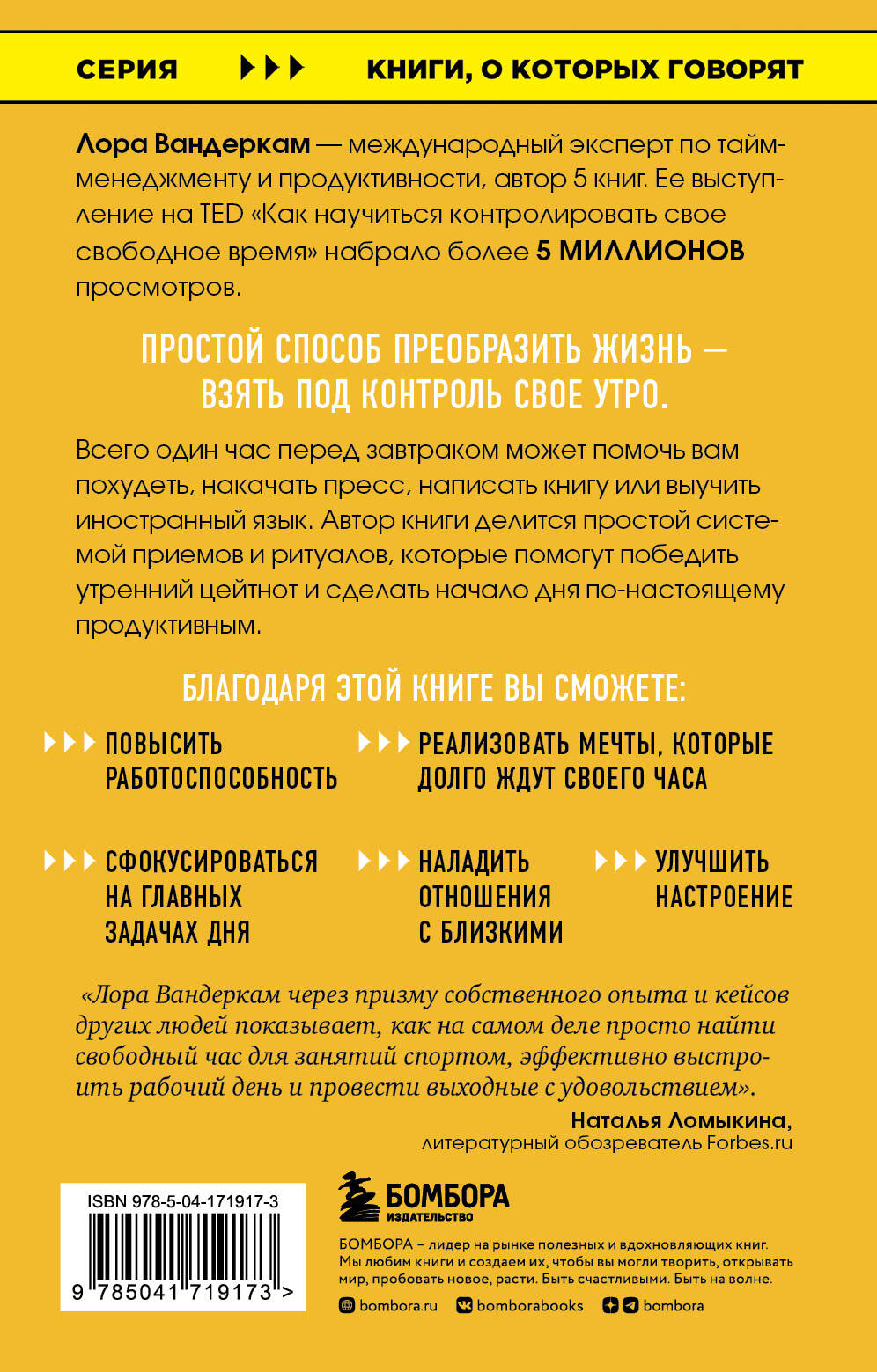 О чем эта книга Эксперт по личной эффективности и управлению временем Лора Вандеркам проанализировала распорядок дня множества успешных людей и написала книгу, в которой подробно рассказывает, какие привычки помогают достигать успеха. Книга позволит вам не только взглянуть по-новому на свою утреннюю рутину, но и покажет, как получать максимальный заряд энергии и пользы каждое утро, на работе и по выходным. Для кого эта книга: ! Для тех, кто бесконечно по утрам переводит будильник «на 5 минут». ! Для тех, кому не хватает времени на действительно важные вещи. ! Для тех, кто хотел бы делать больше и лучше. ! Для тех, кто ищет баланс между работой и личной жизнью. Почему мы решили издать эту книгу Книга долгое время является бестселлером по управлению личной эффективностью в Америке. Более 260 отзывов на Amazon убедили нас, что методики, описанные в этой книге, действительно полезны. Анализируя образ жизни успешных людей, Лора Вандеркамп рассказывает: ! Что самые успешные люди делают до завтрака, - чтобы начать свой день продуктивно, ! Что самые успешные люди делают на выходных, - чтобы подзарядится и начать новую неделю с побед. ! Что самые успешные люди делают на работе, - чтобы успевать больше и делать все лучше. Личный блог автора: http://lauravanderkam.com/ Страница Лоры на Facebook: https://www.facebook.com/168HoursBook 5 из 50 советов из книги по управлению временем: 1. Правда может быть неудобной, но она освобождает. Если у вас есть время на телевизор, значит, у вас есть время и для чтения. Если у вас есть время на телевизор, значит, у вас есть время на занятия спортом. Если у вас есть время на телевизор, значит, у вас есть время на хобби, которые вы забросили, решив, что слишком заняты. Вместо поиска самооправданий взгляните правде в глаза. 2. Начните с малого. Создайте привычку и развивайте ее. 3. Планируйте что-то приятное на каждый новый день. Жизнь становится лучше, если у вас есть причина вылезти из постели. 4. Не особенно заморачивайтесь с ужинами. Смысл семейного ужина не в кулинарных шедеврах, а в том, чтобы побыть вместе. И это не обязательно должен быть ужин! Семейный завтрак - отличная замена для тех, кто занят вечерами. 5. Если вы считаете, что спите недостаточно, используйте не только будильник по утрам, но и сигнал для отхода ко сну. Кроме того, не забывайте отключать свои девайсы: в эпоху тотальной связи это становится очень важно… Некоторые участники проекта Лоры: Стив Райнмунд, бывший председатель совета директоров и генеральный директор PepsiCo Гретхен Рубин, автор бестселлера «Проект Счастье» Кристофер Колвин, партнер в юридической фирме «Крамер, Левин, Нафталин и Френкель» Стив Мёрфи, бывший генеральный директор Rodale и руководитель Christie's Кристин Галиб, специалист по управлению благосостоянием Morgan Stanley Маниша Тхакор, основательница и руководитель компании MoneyZen Wealth Management Шон Ачор, автор бестселлера «Преимущество Счастья» Майк Хакаби, бывший губернатор штата Арканзас Тед Девайн, генеральный директор Insureon Ализа Розен, продюсер телевизионных реалити-шоу Фрэнк Бакстер, бывший руководитель инвестиционного банка Jeffries Дурвал Тавареш, генеральный директор компании Aquabotix, Джекки Пайк, вице-президент по управлению стратегией бренда Capital One, Мэтт Холл встраивает такие перерывы в корпоративную культуру Hill Investment Group