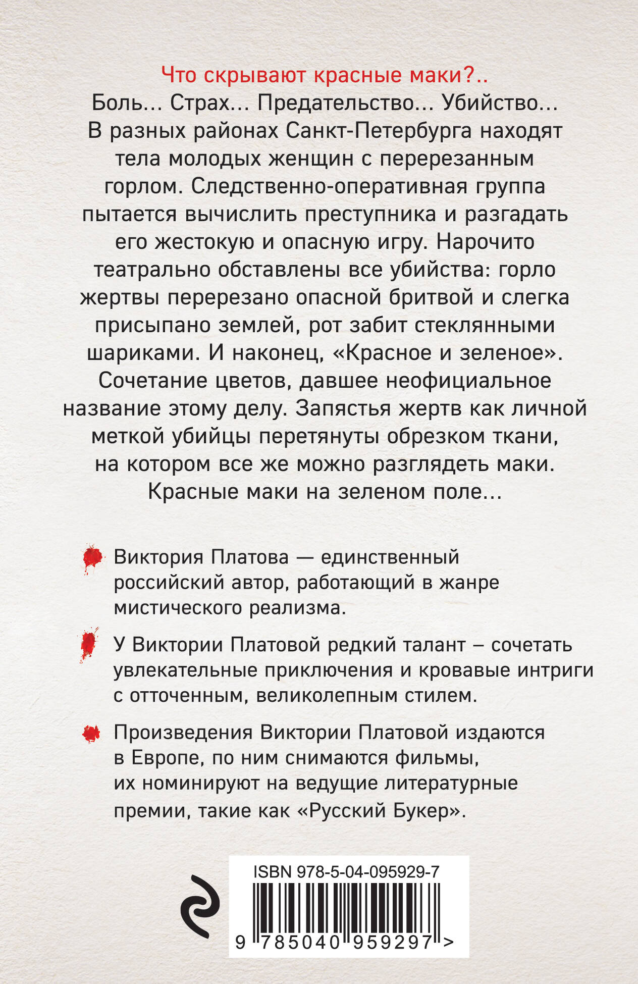 Виктория Платова - единственный российский автор, работающий в жанре мистического реализма. У Виктории Платовой редкий талант - сочетать увлекательные приключения и кровавые интриги с отточенным, великолепным стилем. Произведения Виктории Платовой издаются в Европе, по ним снимаются фильмы, их номинируют на ведущие литературные премии, такие как «Русский Букер». Чтобы познать себя, не обязательно штудировать учебники по психологии. Блистательный разбор психопатологии в романах Платовой подберет ключик ко всем скрытым фобиям, желаниям и мотивам поступков любого человека. Что скрывают красные маки?.. Боль… Страх… Предательство… Убийство… В разных районах Санкт-Петербурга находят тела молодых женщин с перерезанным горлом. Капитан полиции Бахметьев, следователь Ковешников и психолог Анна Мустаева пытаются вычислить преступника и разгадать его игру. То, что он играет в жестокую и опасную игру, становится очевидным, когда находят третью жертву - актрису Анастасию Равенскую. Нарочито театрально обставлены все убийства: горло жертвы перерезано опасной бритвой и слегка присыпано землей, рот забит стеклянными шариками. И, наконец, «Красное и зеленое». Сочетание цветов, давшее неофициальное название этому делу. Запястья жертв, как личной меткой убийцы, перетянуты обрезком ткани, на котором все же можно разглядеть маки. Красные маки на зеленом поле…| Издательство | ООО "Издательство "Эксмо" |