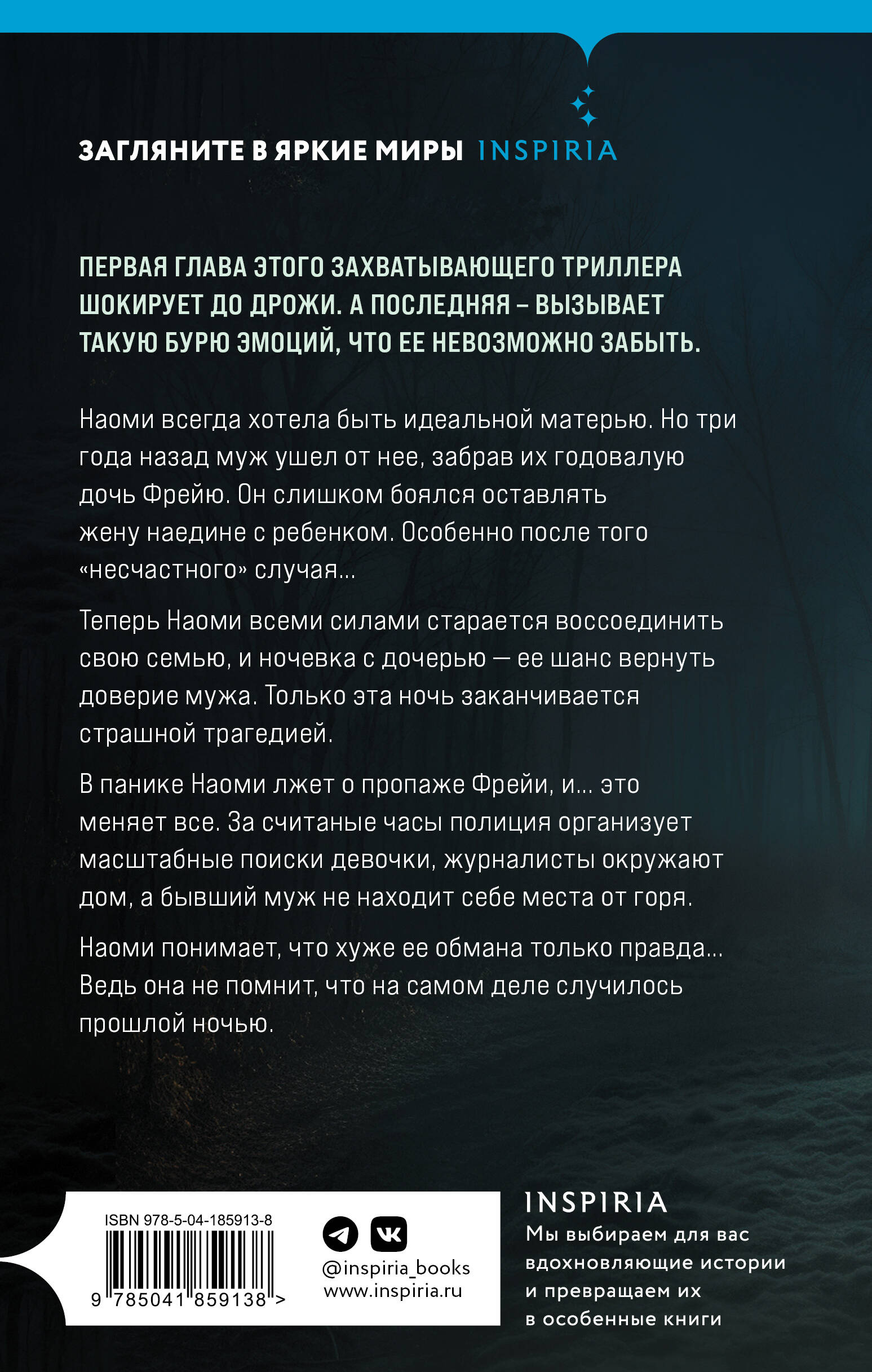 Первая глава этого захватывающего триллера шокирует до дрожи. А последняя - вызывает такую бурю эмоций, что ее невозможно забыть. «Я очень старалась вспомнить события той ночи. Вспомнить хоть что-нибудь: крик в темноте, как Фрейя зовет меня… Ничего. Сплошная темнота». Наоми всегда хотела быть идеальной матерью. Но три года назад муж ушел от нее, забрав их годовалую дочь Фрейю. Он слишком боялся оставлять жену наедине с ребенком. Особенно после того «несчастного» случая… Теперь Наоми всеми силами старается воссоединить свою семью, и ночевка с дочерью - ее шанс вернуть доверие мужа. Только эта ночь заканчивается страшной трагедией. В панике Наоми лжет о пропаже Фрейи, и… это меняет все. За считаные часы полиция организует масштабные поиски девочки, журналисты окружают дом, а бывший муж не находит себе места от горя. Наоми понимает, что хуже ее обмана только правда… Ведь она не помнит, что на самом деле случилось прошлой ночью. _________________________________________________________ «Блестяще написано… Я прочувствовала каждую эмоцию и тут же погрузилась в сюжет. Я буду рекомендовать этот роман всем, кого знаю». - Сара Пирс, автор международных бестселлеров «Санаторий» и «Скала жнеца» «Тревожная и притягательная - история, которая действительно превращается в ночные кошмары. Я не могла оторваться». - Кэтрин Купер, автор бестселлера Sunday Times «Шале» «Адвокатское прошлое этой писательницы делает детективные и судебные части этой книги особенно мощными… У Миддлтон острый взгляд юриста на детали, но настоящая сила истории заключается в убедительном изображении материнской любви… многообещающий дебют с новым голосом». - Daily Mail «Запутанная история о родительской любви и лжи с ужасными последствиями. Мрачная, насыщенная и настолько неотразимая, что я прочла ее за один присест». - Элли Рейнолдс, автор триллера «Дрожь» «Действительно захватывающее чтение, которое заставит вас допоздна не ложиться спать, чтобы закончить его». - Heat| Издательство | ООО "Издательство "Эксмо" |