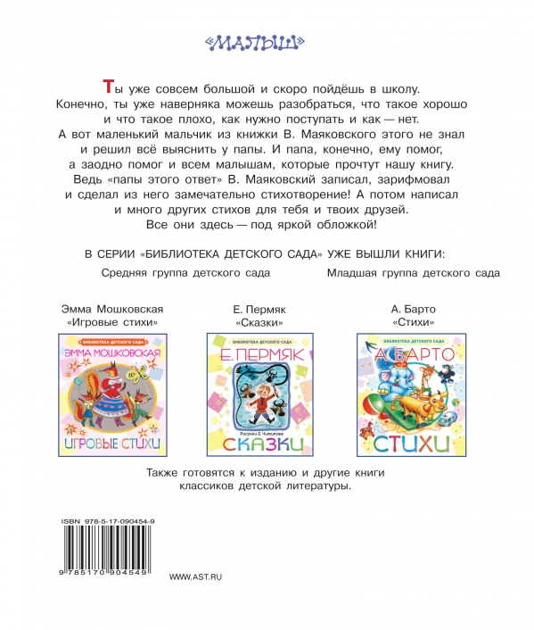 В книгу «Что такое хорошо и что такое плохо» вошли стихотворения Владимира Владимировича Маяковского, которые он написал в начале XX-го века. Драматург, киносценарист, кинорежиссёр, киноактёр, художник, редактор журналов и, конечно, поэт, В. Маяковский оставил яркий след в истории. Более известный как «взрослый» поэт, «поэт революции», он не был чужд и «детских» тем. Отсюда его знаменитые строки о том, «что такое хорошо и что такое плохо», стихи «про моря и про маяк», книга, где «что ни страница, - то слон, то львица». В нашу книгу вошли самые лучшие стихи В. Маяковского для детей, с которыми необходимо познакомиться каждому ребёнку при подготовке к школе.<br /> Для подготовительной группы детского сада.