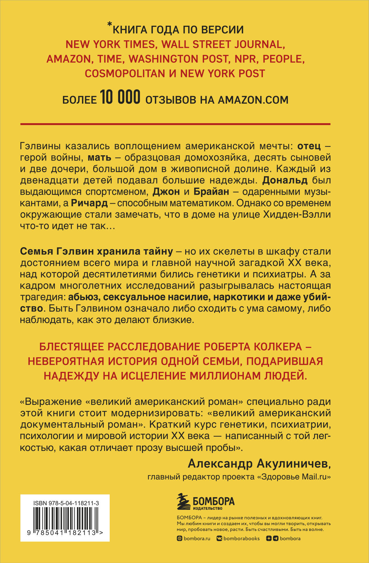Гэлвины казались образцовой американской семьей. Отец - военный, мать-домохозяйка, оба активно участвуют в общественной и светской жизни штата и страны. Двенадцать детей - десять мальчиков и две девочки - гордость семьи, они талантливы и подают большие надежды. Внезапно старшему сыну, успешному студенту университета, ставят диагноз "шизофрения". В течение нескольких лет еще у пятерых сыновей Гэлвинов обнаруживается это серьезное заболевание. Дальше начинается ад: оказывается, за идеальным фасадом скрывалась далеко не идеальная жизнь: физическое и сексуальное насилие, абьюз, наркотики - но родители, Дон и Мими, до последнего закрывали глаза на происходящее. Всё это неминуемо приводит к трагичным последствиям и разобщению членов семьи. На протяжении нескольких десятилетий ученые, психиатры и генетики бьются над загадкой семьи Гэлвинов, выдвигая самые разные гипотезы. Но удастся ли им найти ответ и подарить надежду миллионам людей?| Издательство | Форс Украина ООО |