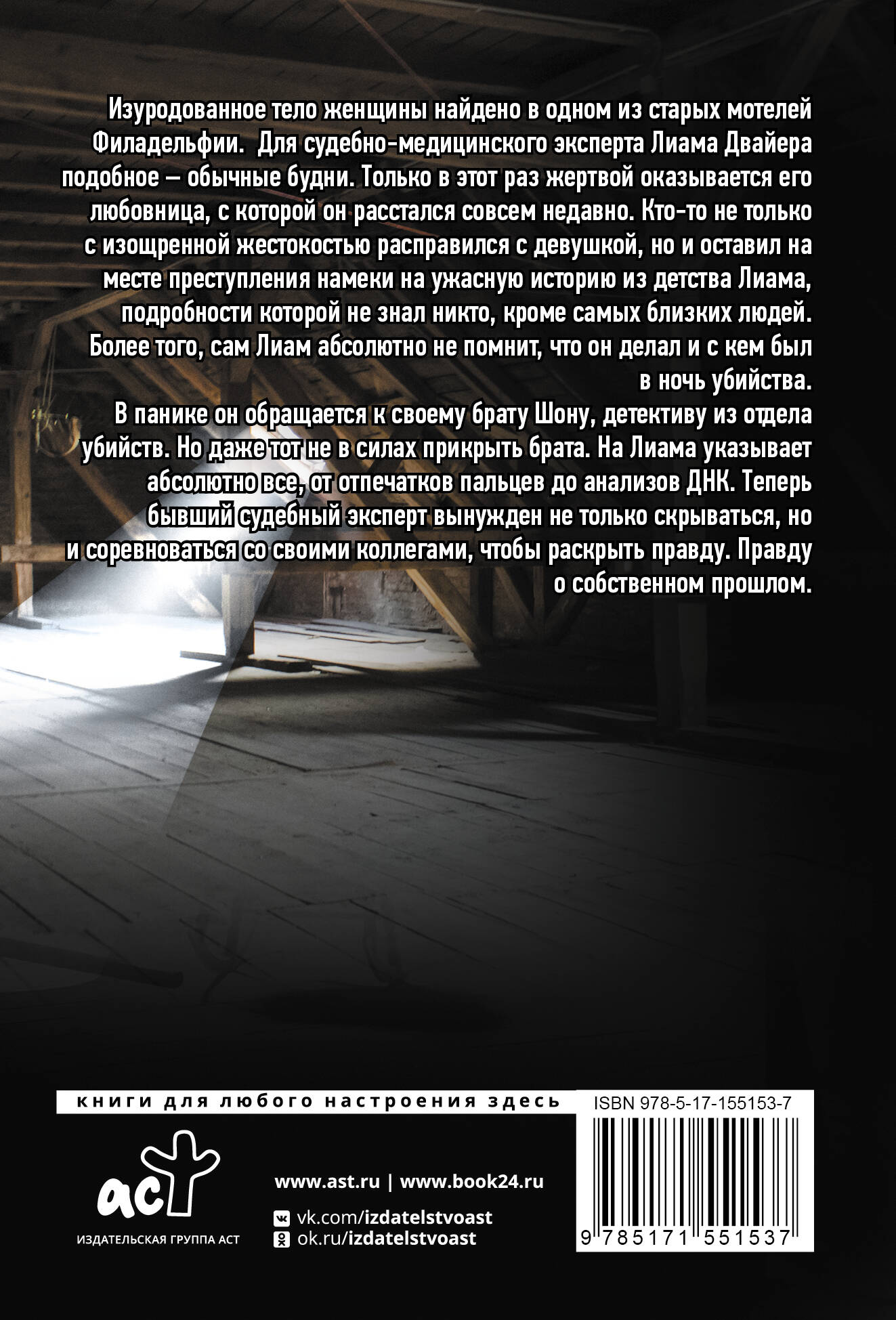Изуродованное тело женщины найдено в одном из потрепанных мотелей Филадельфии. Для судебно-медицинского эксперта Лиама Двайера подобное - обычные будни. Только в этот раз жертвой оказывается его любовница, с которой он расстался совсем недавно. Кто-то не только с изощренной жестокостью расправился с девушкой, но и оставил на месте преступления намеки на ужасную историю из детства Лиама, подробности которой не знал никто, кроме самых близких людей. Более того, сам Лиам абсолютно не помнит, что он делал и с кем был в ночь убийства. В панике он обращается к своему брату, Шону, детективу из отдела убийств. Но даже тот не в силах прикрыть брата. На Лиама указывает абсолютно все, от отпечатков пальцев до анализов ДНК. Теперь бывший судебный эксперт вынужден не только скрываться, но и соревноваться со своими коллегами, чтобы раскрыть правду. Правду о собственном прошлом. И когда уляжется дым над семейной драмой, кто останется стоять?| Издательство | ИЗДАТЕЛЬСТВО "АСТ" |