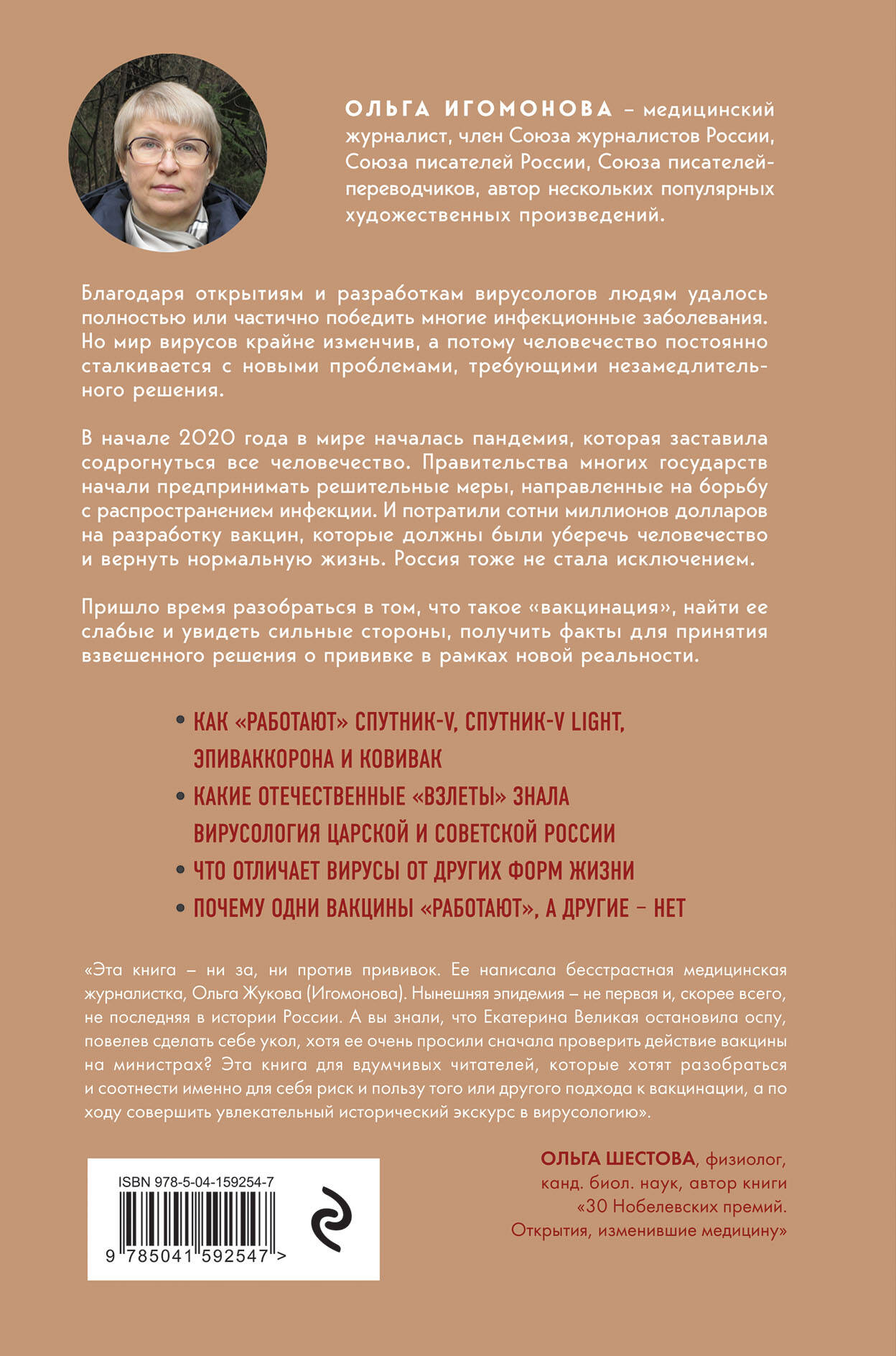 «Спутник», «Ковивак» или «Эпивак»? Что лучше? А может быть, все это вообще не работает? Зачем весь мир так упорно пытаются привить непроверенными вакцинами? Или они проверены? Теория заговора или безысходность? А наши вообще что-то могут изобрести? Эта книга расскажет об удивительной истории вирусологии в России. Вы узнаете, какие мировые открытия совершили ученые, кто трудится в секретных лабораториях и почему наша наука по-прежнему впереди планеты всей. Зачем читать книгу: - вы узнаете, какую вакцину выбрать, исходя из личной ситуации; - вы разберетесь, где страхи истинные, а где ложные; - вы поймете, как действуют вирусы и в каких случаях может, а в каких не может помочь вакцинация; - вы восхититесь удивительными историями открытий российских ученых в XIX, XX и XXI веке; - вы вспомните, что русские не зря слывут в мире очень умными и талантливыми людьми.| Издательство | ООО "Издательство "Эксмо" |