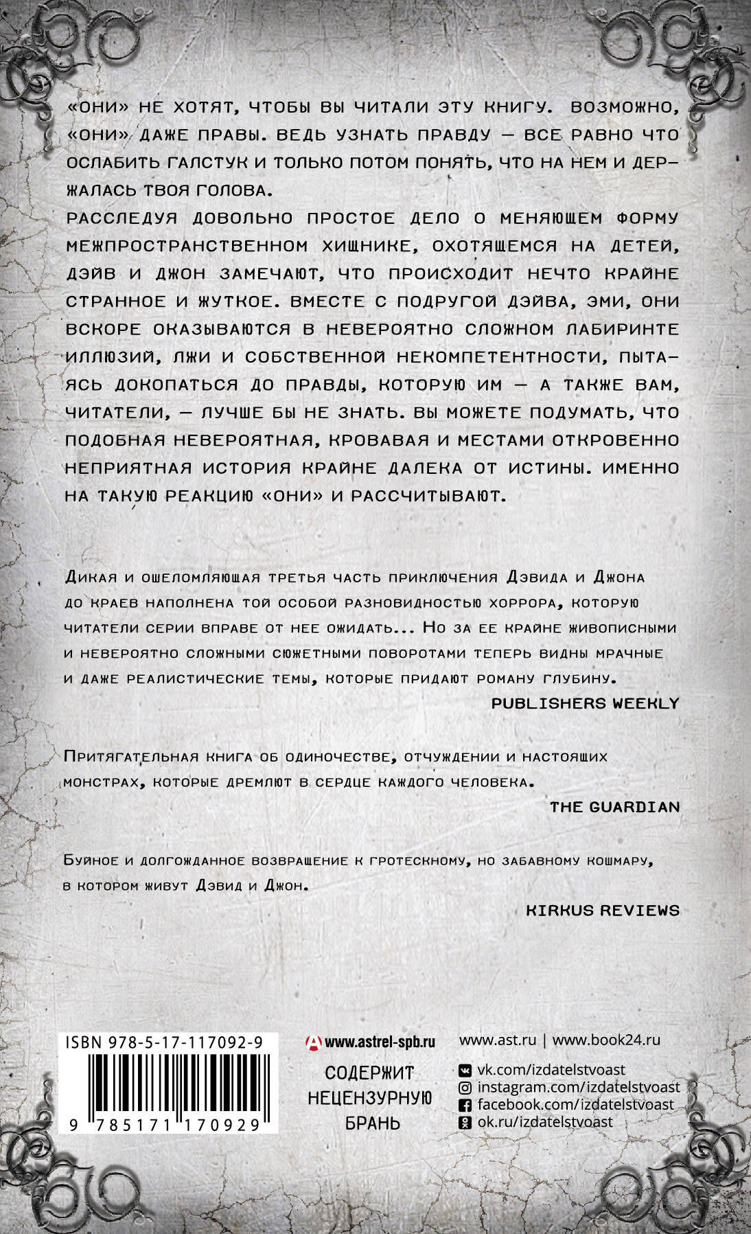 Дикая и ошеломляющая третья часть приключения Дэвида и Джона до краев наполнена той особой разновидностью хоррора, которую читатели серии вправе от нее ожидать… Но под ее крайне живописными и невероятно сложными темами теперь видны мрачные и даже реалистические темы, которые придают роману глубину. Publishers Weekly Буйное и долгожданное возвращение к гротескному, но забавному кошмару, в котором живут Дэвид и Джон. Kirkus Reviews| Издательство | ИЗДАТЕЛЬСТВО "АСТ" |