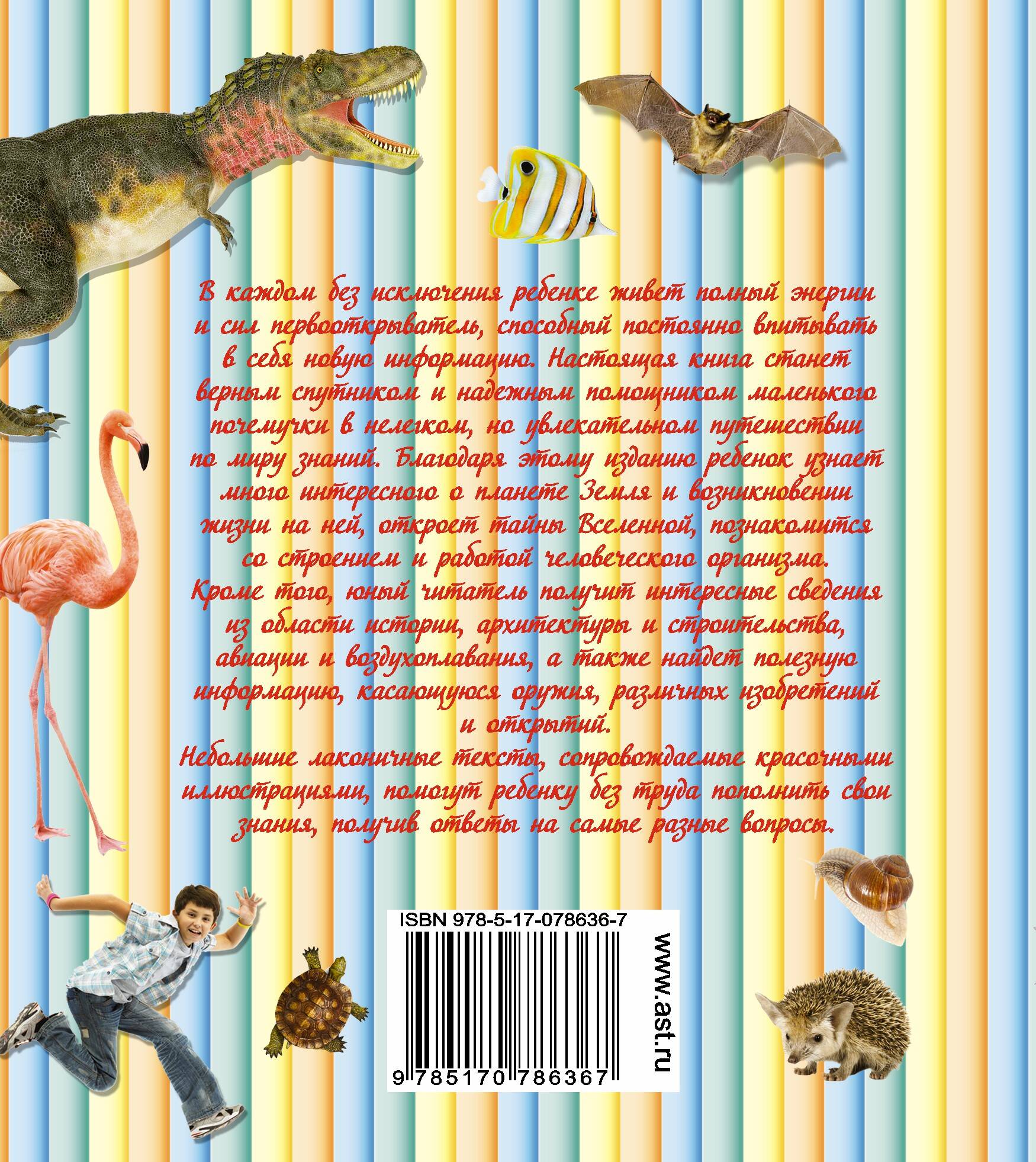 В каждом без исключения ребенке живет полный энергии и сил первооткрыватель, способный постоянно впитывать в себя новую информацию. Настоящая книга станет верным спутником и надежным помощником маленького почемучки в нелегком, но увлекательном путешествии по миру знаний. Благодаря этому изданию ребенок узнает много интересного о планете Земля и возникновении жизни на ней, откроет тайны Вселенной, познакомится со строением и работой человеческого организма. Кроме того, юный читатель получит интересные сведения из области истории, архитектуры и строительства, авиации и воздухоплавания, а также найдет полезную информацию, касающуюся оружия, различных изобретений и открытий. Небольшие лаконичные тексты, сопровождаемые красочными иллюстрациями, помогут ребенку без труда пополнить свои знания, получив ответы на самые разные вопросы.| Издательство | Издательство "АСТ" |