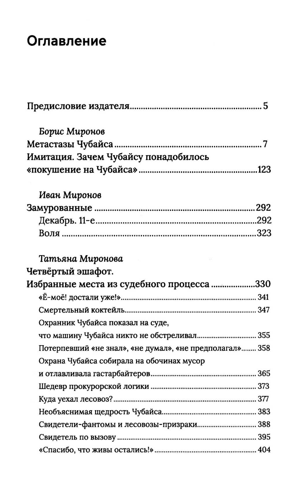 За последние несколько лет Россия стала свидетелем массового исхода высокопоставленных чиновников, включая больше десятка вице-премьеров. Среди тех, кто покинул страну, особо выделяется фигура Анатолия Чубайса. Его имя стало символом приватизации и реформ, которые привели к масштабному разграблению активов Советского Союза. В новой книге известных писателей исследуется многолетняя разрушительная деятельность Анатолия Чубайса, занимавшего высокие должности в российском руководстве без малого 30 лет, руководившего грабительской ваучерной приватизацией 90-х и разрушением отечественной энергетики в 2000-е годы, «освоением» бюджетных средств в области нанотехнологий в 2010-е. Первую книгу о преступлениях Чубайса Борис Миронов выпустил ещё в 2002-году, а Иван Миронов по ложному обвинению в покушении на Чубайса просидел два года в самом жёстком тюремном изоляторе - «Кремлёвском централе» и был полностью оправдан коллегией присяжных заседателей. Без малого год шёл беспрецедентный по накалу судебный процесс по «делу покушения на Чубайса», ещё бы, никогда прежде в новейшей истории России фигурантом судебного разбирательства не становился столь высокого ранга властьимущий и можно только представить какой мощи пресс давления на суд задействовал всемогущий тогда Чубайс! Каждое заседание суда (каждое!) Татьяна Миронова остро и умно анализировала в своих репортажах.| Издательство | Книжный мир |