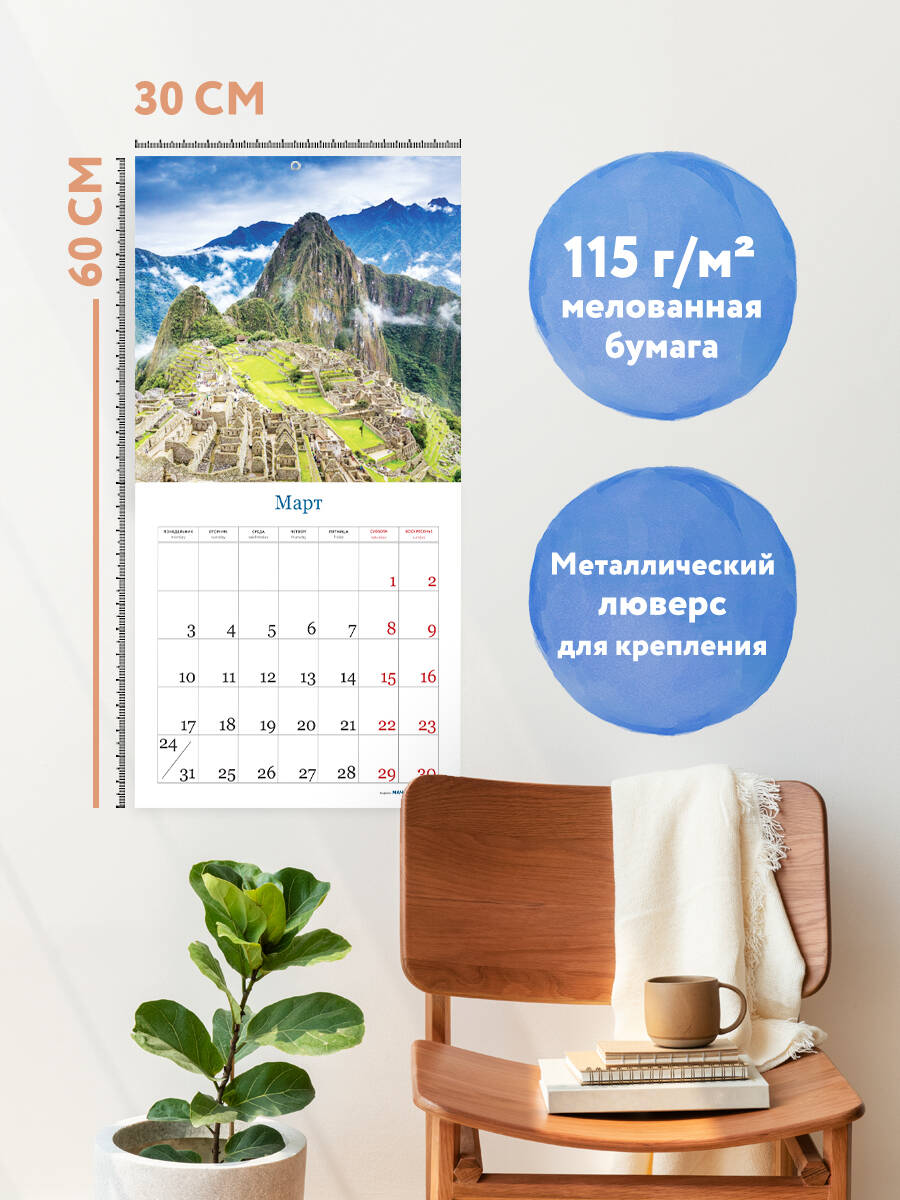 О серии: Наши настенные календари отличаются высоким качеством исполнения! Тщательно подобранные иллюстрации, напечатанные на глянцевой бумаге высочайшего качества, станут настоящим украшением дома, а в календарной сетке найдется место для ваших планов: большие клетки позволят делать записи и организовать свой год! В календаре также отмечены все государственные праздники. В серии настенных календарей издательства «ЭКСМО» каждый найдет тему по вкусу: великие художники, великолепные подборки с самыми знаменитыми произведениями искусства, легендарные кинематографические саги и игры, главные книжные авторы и бестселлеры, фотографии и иллюстрации любимых животных и многое-многое другое! О календаре: В календаре подобраны красочные фотографии чудес света: невероятные архитектурные шедевры и природные красоты. Отправляйтесь исследовать город на шелковом пути Бухару, разгадайте загадку таинственного Мачу-Пикчу или прогуляйтесь по местам съемок фильма «Аватар» в национальном парке Чжанцзяцзе. А еще в календарь включен дополнительный разворот с первыми четырьмя месяцами 2026 года! Для кого: Этот путеводитель отлично подойдет для тех, кто хочет открыть для себя удивительные и уникальные места нашей планеты. Технические параметры: - Тип календаря - настенный перекидной. - Год - 2025. - Календарная сетка - с разбивкой по месяцам. - Вид скрепления - скрепка. - Ширина - 30 см. - Высота - 30 см. - Внутренний блок - мелованная бумага 150 г/м2. - Подложка - плотный гофрокартон для поддержания формы. - Индивидуальная упаковка в плотный целлофановый пакет.| Издательство | ООО "Издательство "Эксмо" |