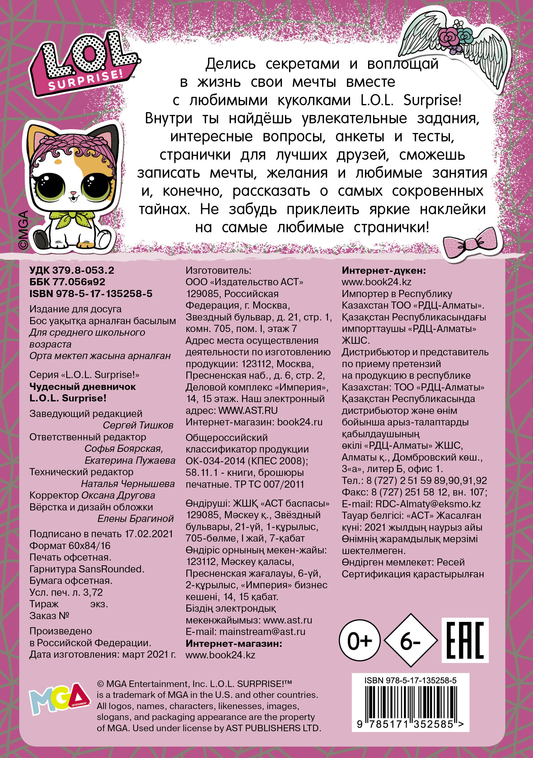 Делись секретами и воплощай в жизнь свои мечты вместе с любимыми куколками L.O.L. Surprise! Внутри ты найдёшь увлекательные задания, интересные вопросы, анкеты и тесты, странички для лучших друзей, сможешь записать мечты, желания и любимые занятия и, конечно, рассказать о самых сокровенных тайнах. Не забудь приклеить яркие наклейки на самые любимые странички!| Издательство | ИЗДАТЕЛЬСТВО "АСТ" |