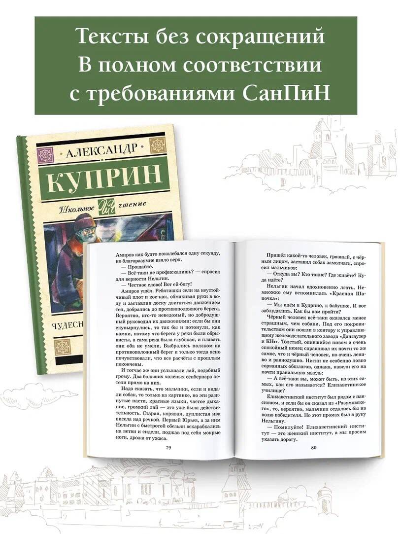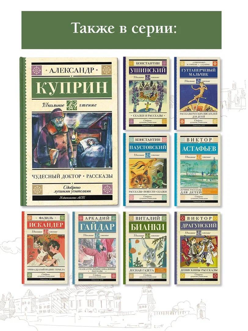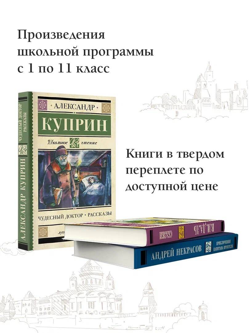Александр Иванович Куприн (1870-1938) - знаменитый русский писатель, автор романов, повестей, очерков и рассказов. Самые известные произведения Куприна "Гранатовый браслет", "Олеся" и "Юнкера" сделали его классиком отечественной и мировой литературы. Его рассказы для детей учат с добротой относиться к людям и помогать им. Образцом милосердия и любви является герой рассказа "Чудесный доктор" профессор Пирогов. В детстве он и сам пережил чудесный случай, который сподвигнул его стать врачом и спасать людей. Для обедневшей семьи Мерцаловых доктор - настоящий ангел-хранитель: он не только лечит больную девочку, но и меняет жизнь героев. На примере этой истории юный читатель узнает, что даже одно доброе дело способно сделать мир лучше. В сборник также вошли рассказы и повести: "Тапёр", "Бонза", "Храбрые беглецы", "Ю-ю", "Белый пудель" и другие произведения из школьной программы.| Издательство | ИЗДАТЕЛЬСТВО "АСТ" |