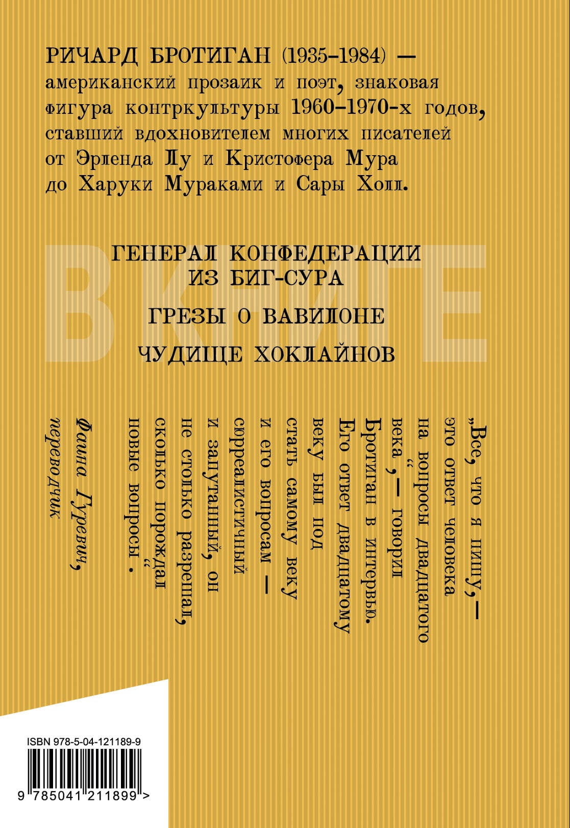 Переиздание трех произведений Ричарда Бротигана в одном томе! С обновленными переводами. Ричард Бротиган (1935-1984) - американский прозаик и поэт, знаковая фигура контркультуры 1960-х-1970-х годов, ставший вдохновителем многих писателей от Эрленда Лу и Кристофера Мура до Харуки Мураками и Сары Холл. В книгу вошли: первый роман «Генерал Конфедерации из Биг-Сура» о знакомстве простого парня с бродягой, гордящимся своим предком - якобы генералом Конфедерации, «Грезы о Вавилоне» - черная комедия, действие которой происходит в 1942 году в Сан-Франциско и «Чудище Хоклайнов» - готический вестерн о незадачливых наемных убийцах, получивших заказ на загадочное чудище, терроризирующее Дикий Запад. Мини-коллекция уникальной прозы Ричарда Бротигана - значимое событие для всех почитателей творчества писателя, который был в этом мире не дома.| Издательство | ООО "Издательство "Эксмо" |