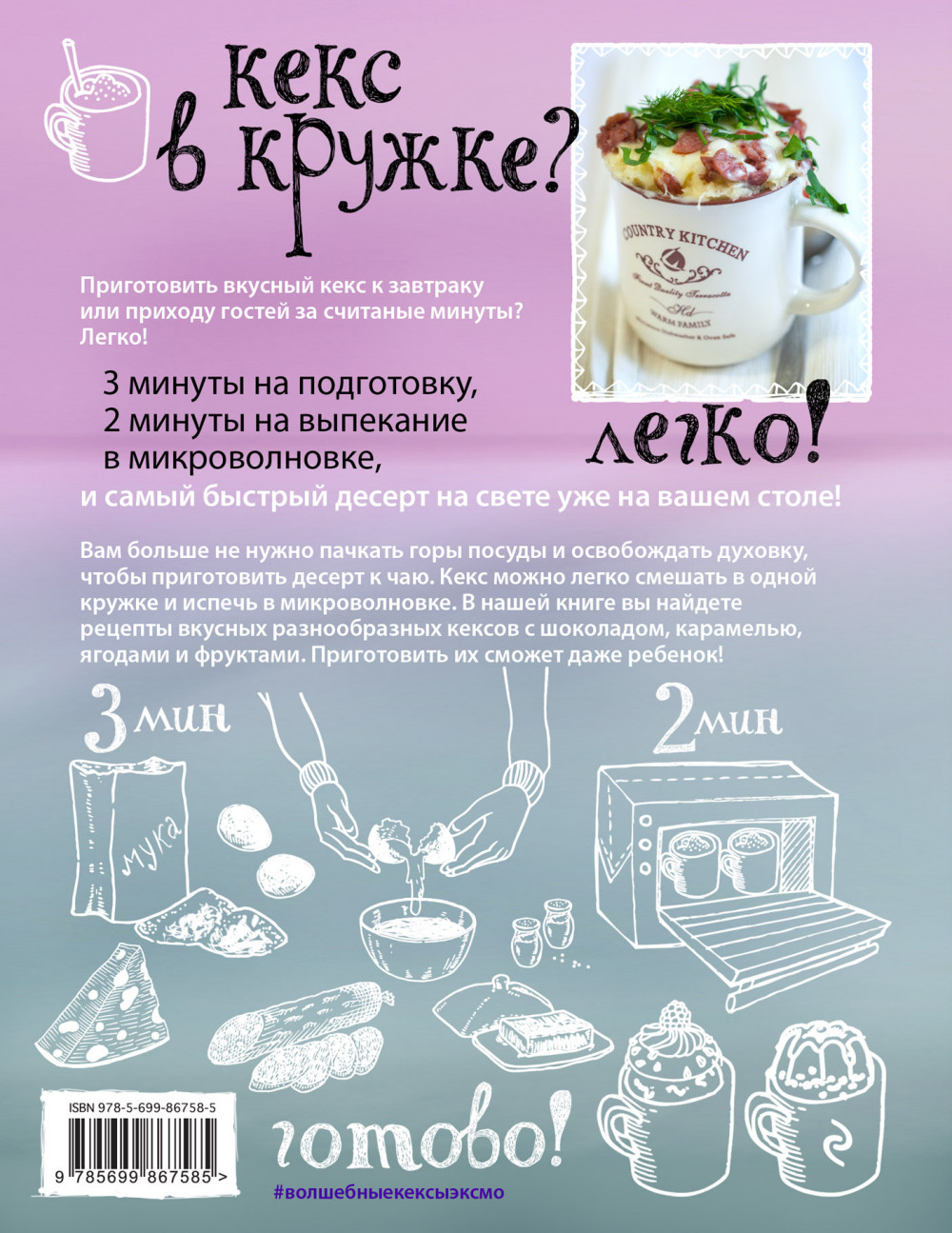 Приготовь мегашедевр за 5 минут! Все что нужно - это обычная кружка и микроволновая печь! 3 минуты на подготовку, 2 на приготовление и вкусный ароматный кекс готов! Такой десерт порадует вас на завтрак или к приходу гостей. В нашей книге мы собрали яркие, простые рецепты вкусных кексов в кружке. Яблочные, шоколадные, банановые, с наполнителем, кремом и многие другие. Приготовление выпечки больше не будет проблемой. Готовьте и удивляйте!