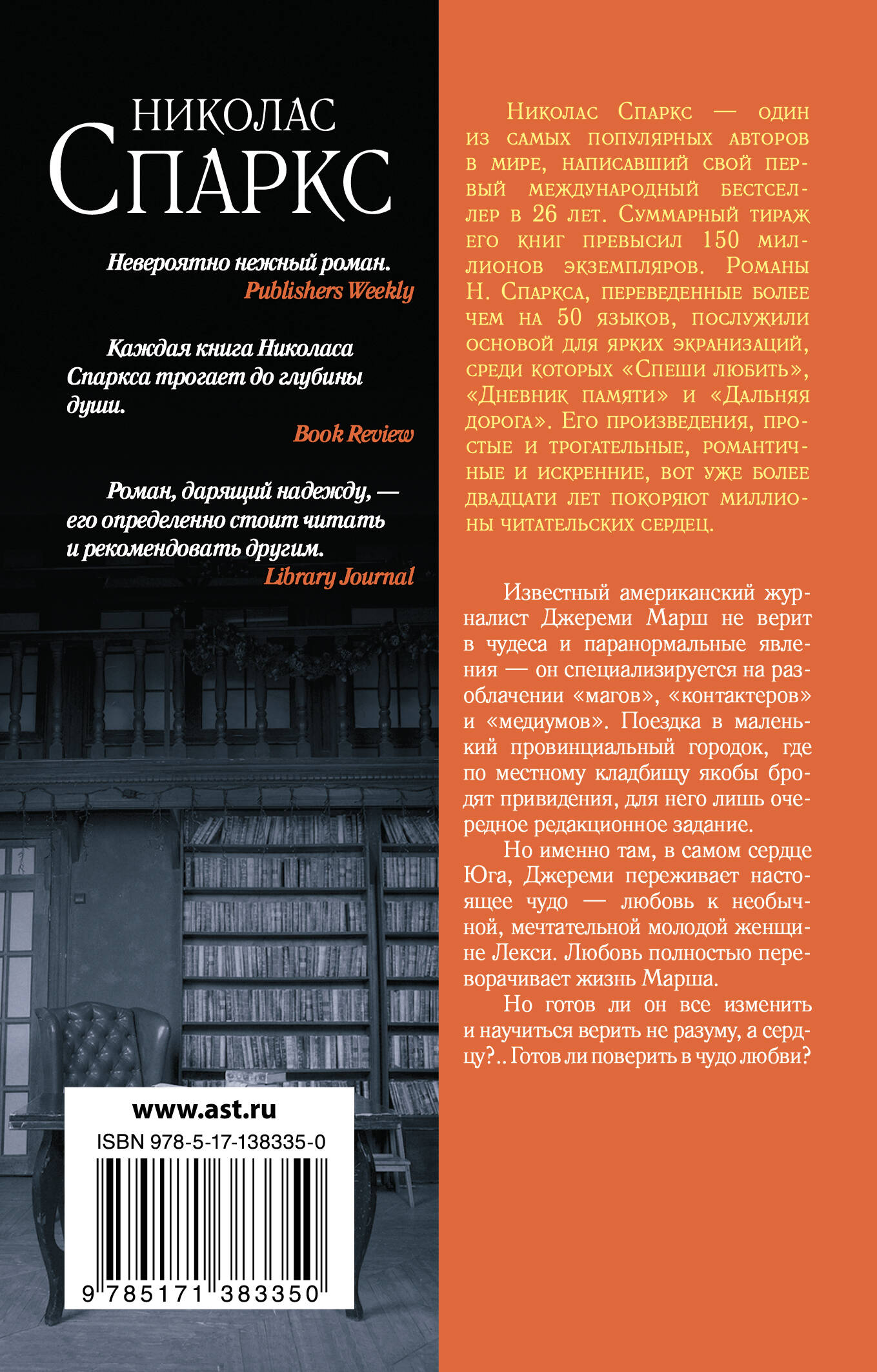 Известный американский журналист Джереми Марш не верит в чудеса и паранормальные явления - он специализируется на разоблачении "магов", "контактеров" и "медиумов". Поездка в маленький провинциальный городок, где по местному кладбищу якобы бродят привидения, для него лишь очередное редакционное задание. Но именно там, в самом сердце Юга, Джереми переживает истинное чудо - любовь к необычной, мечтательной молодой женщине Лекси. Любовь полностью переворачивает жизнь Марша. Но готов ли он все изменить и научиться верить не разуму, а сердцу?.. Готов ли поверить в чудо любви?| Издательство | ИЗДАТЕЛЬСТВО "АСТ" |