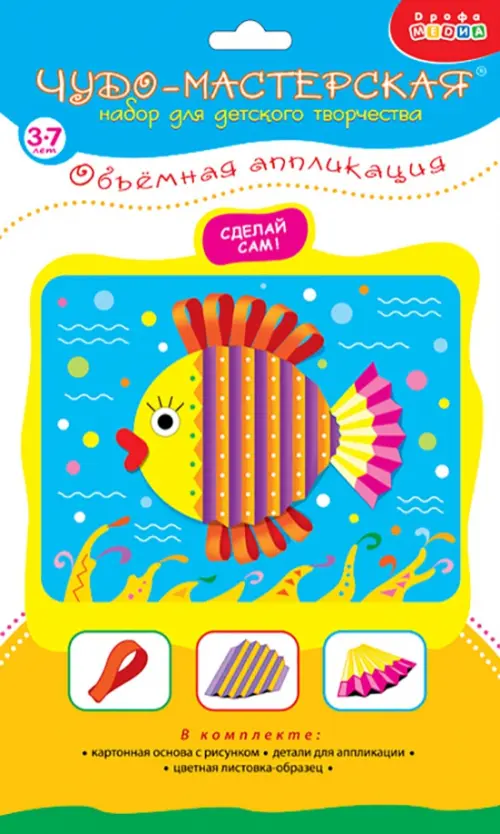 С помощью набора для творчества "Объемная аппликация" юный творец создаст красочную картинку с объемными элементами. Поделка проста в исполнении - возьмите уже вырубленные детали картинки, с помощью инструкции сделайте некоторые из них выпуклыми или "плиссированными" и наклейте на картинку-основу. Готовую аппликацию можно не только повесить на стенку в качестве украшения, но и использовать во время игры.