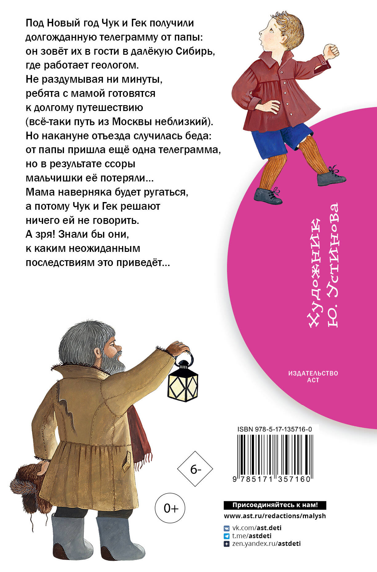 Одно из самых популярных произведений - рассказ "Чук и Гек" - Аркадий Гайдар написал в 1939 году. Это история про двух братьев, которые под Новый год поехали с мамой на другой край нашей необъятной родины в Сибирь в гости к папе, который работает геологом. Впереди их ждёт долгий путь и удивительные красоты сибирской природы. Но не обошлось и без приключений - Чук и Гек всегда придумают, чем занять себя и озаботить маму. Произведение включено в перечень книг, рекомендованных школьникам Министерством образования и науки РФ для самостоятельного чтения. Рисунки Ю. Устиновой. Для младшего школьного возраста.| Издательство | ИЗДАТЕЛЬСТВО "АСТ" |