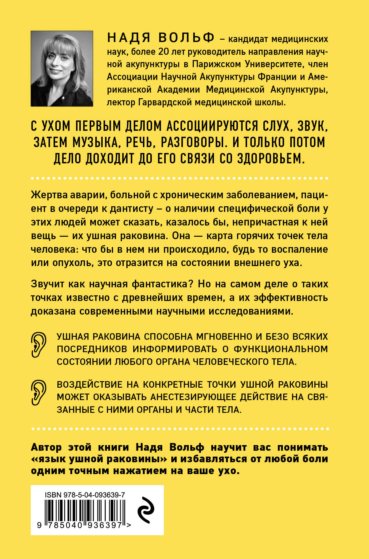 Организм - это единая очень сложная система, и в нем, можно сказать, все связано со всем. И если наука сейчас только начинает понимать, как именно это работает, то о наличии такой связи знали еще древние люди. Именно поэтому появилась такая древняя, простая, но удивительно действенная методика - аурикулярная терапия. Это особая область иглоукалывания, которая использует уникальные свойства ушной раковины совмещать в себе точки, связанные со всем остальным телом. Наше тело - это самолет, а ушная раковина - его приборная панель. И для того чтобы воспользоваться ею, достаточно иметь под рукой шариковую ручку или зернышко риса, чтобы нажать ими на нужную точку. Узнайте все об аурикулярных точках, принципах их работы и возвращении почти забытой техники в медицину.| Издательство | ООО "Издательство "Эксмо" |