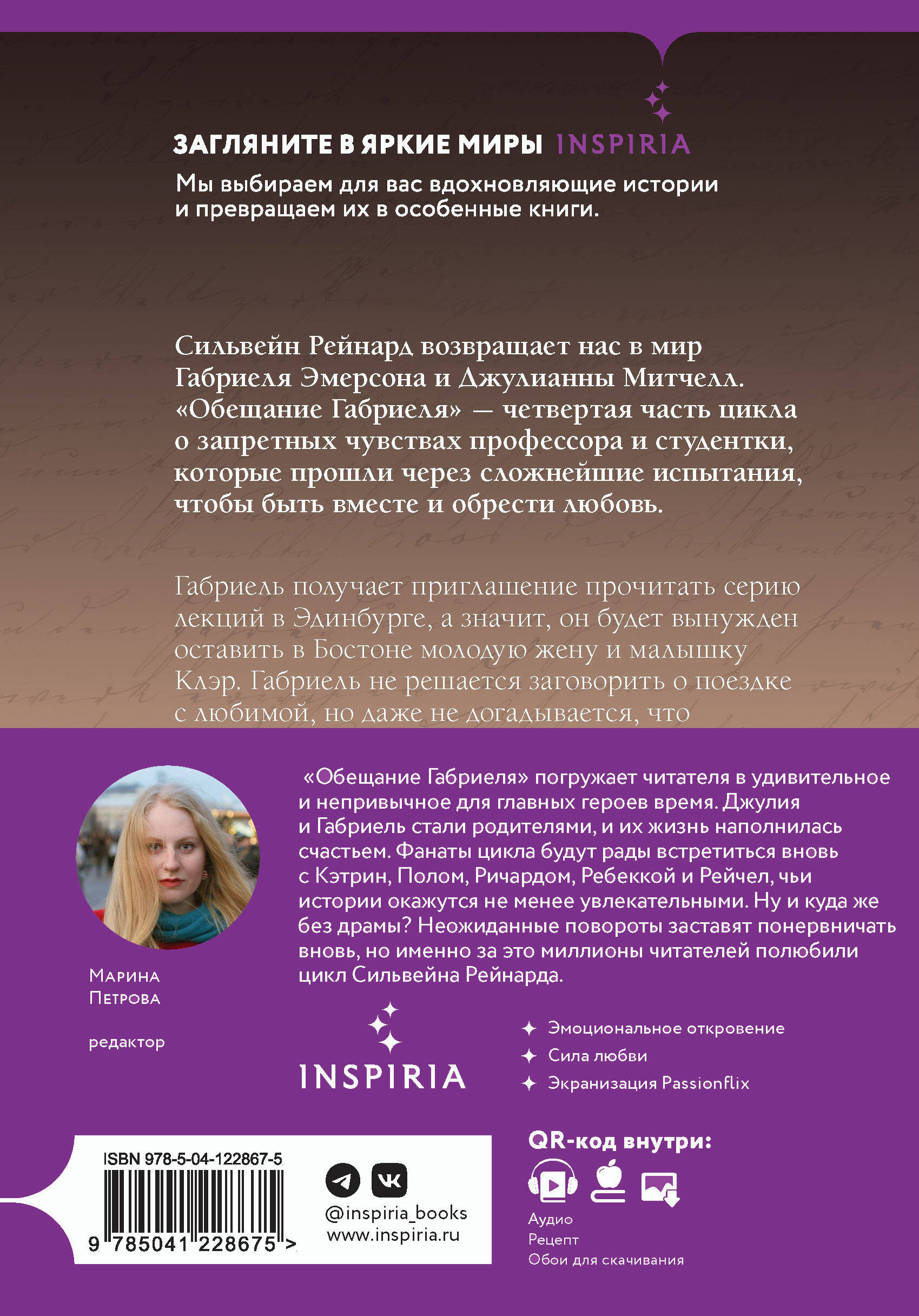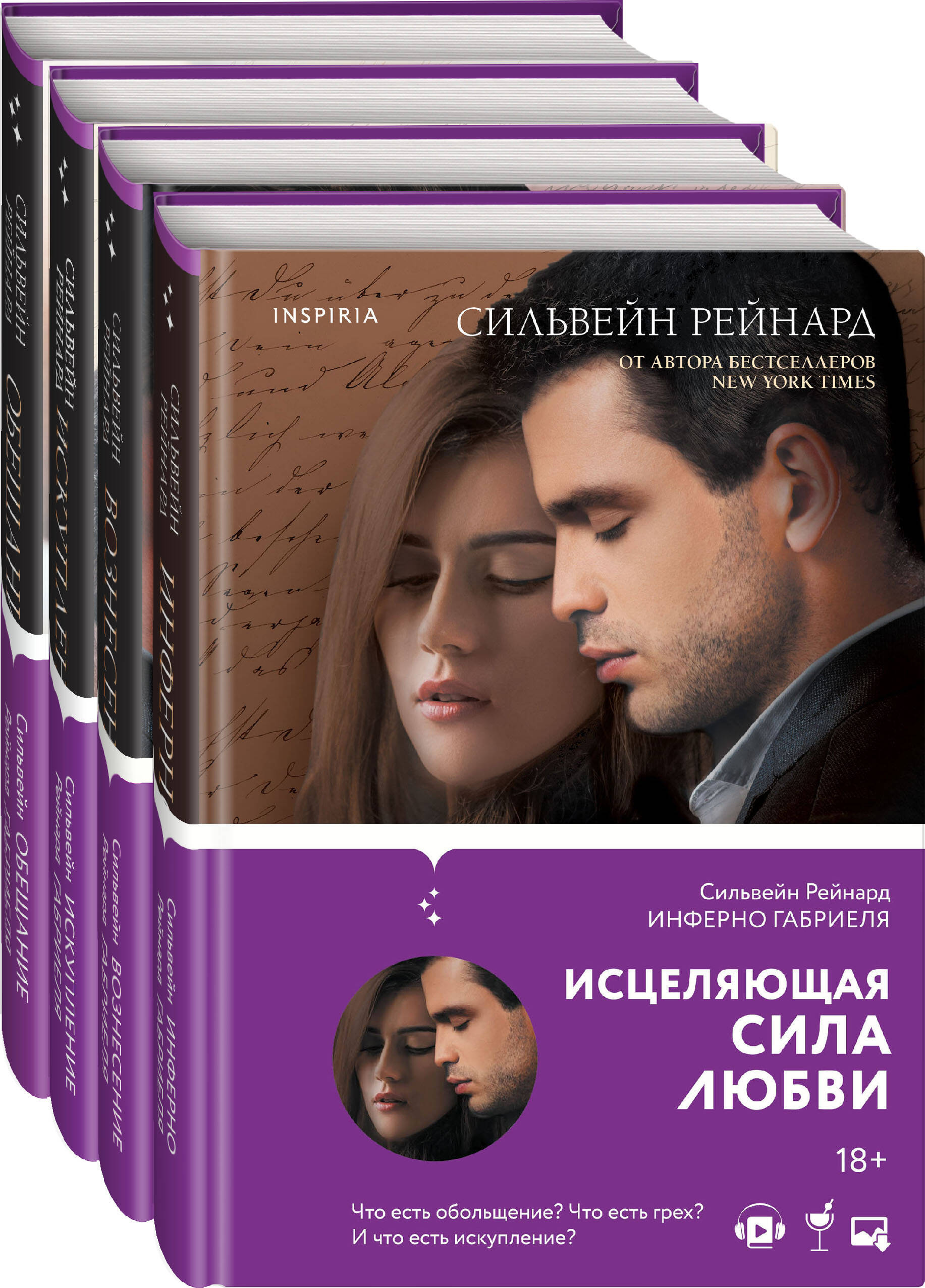 В Америке романы писателя несколько раз входили в список бестселлеров по версии New York Times и USA Today. Газета Huffington Post назвала роман «Инферно Габриеля» лучшим произведением о любви преподавателя и студентки. По словам самого Рейнарда, ему нравится видеть, как литература помогает исследовать человеческую жизнь в различных ее проявлениях. Также ему импонирует использовать искусство для более детального описания образа и характера героев либо их поведения в той или иной ситуации. Сильвейн Рейнард - автор бестселлеров NEW YORK TIMES, создавший чувственную трилогию о спасении одного мужчины и пробуждении одной женщины. История профессора Габриеля Эмерсона и его возлюбленной Джулии разобьет ваше сердце. «Инферно Габриеля» (#1): Загадочный и привлекательный профессор Габриель Эмерсон изучает творчество Данте. Таким его знают студенты, но они даже не догадываются, что в прошлом профессора есть тайна, о которой никто не должен узнать. Что он скрывает? Милая и наивная Джулия Митчелл пополнила ряды добросовестных студентов. Искры. Всполохи. Взрыв. Эта встреча изменит жизни обоих. Габриелю предстоит распутать липкую паутину загадок, недомолвок и встретиться лицом к лицу со своими демонами. Ведь иногда, чтобы увидеть свет, нужно погрузиться во тьму. «Вознесение Габриеля» (#2): Мосты сожжены. Выбор сделан. Профессор Габриель Эмерсон и его бывшая студентка Джулия Митчелл наслаждаются обществом друг друга под жарким итальянским солнцем. Чувства раскалены до предела, и влюбленным совсем не хочется возвращаться к обычной жизни. Но все прекрасное рано или поздно заканчивается. Габриель и Джулия столкнутся с жесткими правилами университета. К тому же им предстоит нелегкая встреча с бывшей возлюбленной профессора. Настоящая любовь способна пережить любые испытания. На что ты готов пойти ради своей Беатриче, Габриель? «Искупление Габриеля» (#3): Ради любимой Джулии профессор Габриель Эмерсон уходит из университета. Впереди новая жизнь, и влюбленные готовы к любым испытаниям, которые готовит для них судьба. Джулии предстоит выступить с лекцией в Оксфорде, где не все приветствуют ее роман с профессором. Самая темная тайна Габриеля под угрозой раскрытия, но он не собирается сдаваться. Пытаясь узнать больше о своих биологических родителях, Габриель запускает цепь событий, последствия которых необратимы. «Обещание Габриеля» (#4): Габриель получает приглашение прочитать серию лекций в Эдинбурге, а значит, он будет вынужден оставить в Бостоне молодую жену и малышку Клэр. Габриель не решается заговорить о поездке с любимой, но даже не догадывается, что и Джулианна с ним не до конца откровенна. Семье угрожает опасность, и непреодолимые обстоятельства заставляют героев идти на жертвы. Габриелю предстоит сдержать обещание и сделать самый сложный выбор в жизни. Впереди - новые испытания. «Очень трудно не привязаться к мрачному и таинственному Габриелю, по которому вы обязательно будете пускать слюни». - Waves of Fiction «Профессор Эмерсон, ты украл мое сердце». - Goodreads| Издательство | ООО "Издательство "Эксмо" |