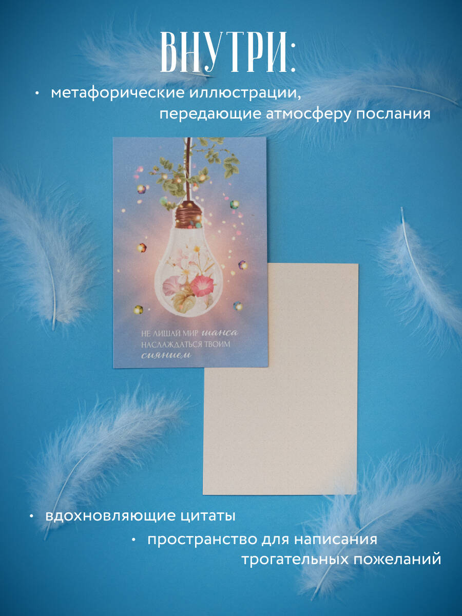 Открытки «Чувствуй» - это искренний и приятный подарок для близких. Поделитесь тёплыми чувствами, порадуйте своим согревающим вниманием и дайте себе возможность открыться миру. Ольга Берг, психолог и супервизор, автор бестселлеров «Лови день» и «Путешествие к центру себя», создала для вас: *метафорические иллюстрации, которые передают атмосферу вашего послания; *вдохновляющие цитаты; *пространство для написания трогательных пожеланий; *доступную инструкцию исцеляющего ритуала «письмо благодарности себе и близким».| Издательство | ООО "Издательство "Эксмо" |