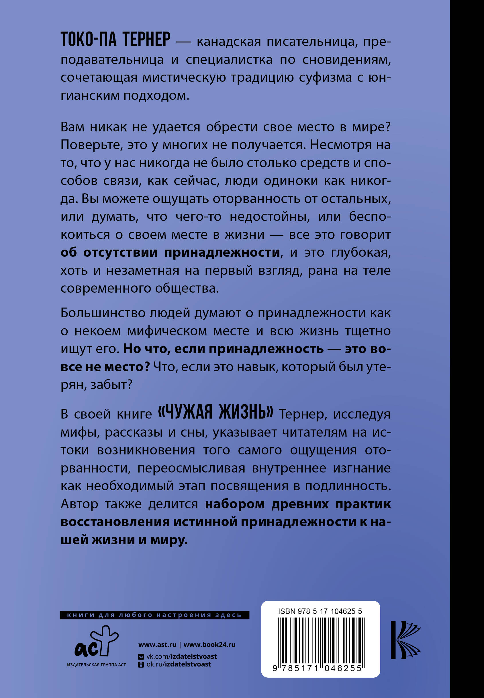 Токо-па Тернер - канадская писательница, преподавательница и специалистка по сновидениям, сочетающая мистическую традицию суфизма с юнгианским подходом. В своей работе Токо-па делает упор на возрождении женственности, взаимосвязи с природой, должном уважении к горю и созидании красоты. Она живет на маленьком острове в море Селиш в Британской Колумбии. Вам никак не удается обрести свое место в мире? Поверьте, это у многих не получается. Несмотря на то, что у нас никогда не было столько средств и способов связи, как сейчас, люди одиноки как никогда. Вы можете ощущать оторванность от остальных, или думать, что чего-то недостойны, или беспокоиться о своем месте в мире - все это говорит об отсутствии принадлежности, и это глубокая, хоть и незаметная на первый взгляд, рана на теле современного общества. Большинство людей думают о принадлежности как о некоем мифическом месте, и всю жизнь тщетно ищут его. Но что, если принадлежность - это вовсе не место? Что, если это навык, который был утерян, забыт? В своей книге Тернер, исследуя мифы, рассказы и сны, указывает читателям на истоки возникновения того самого ощущения оторванности, переосмысливая внутреннее изгнание как необходимый этап посвящения в подлинность. Автор делится компетенциями принадлежности - набором древних практик восстановления истинной принадлежности к нашей жизни и миру. Книга "Чужая жизнь" завоевала множество наград, включая золотую премию Nautilus 2017 года и золотую премию Readers' Favorite 2018 года, а также вошла в шорт-лист премии Whistler Independent Book Awards 2018 года.| Издательство | Издательство "АСТ" |