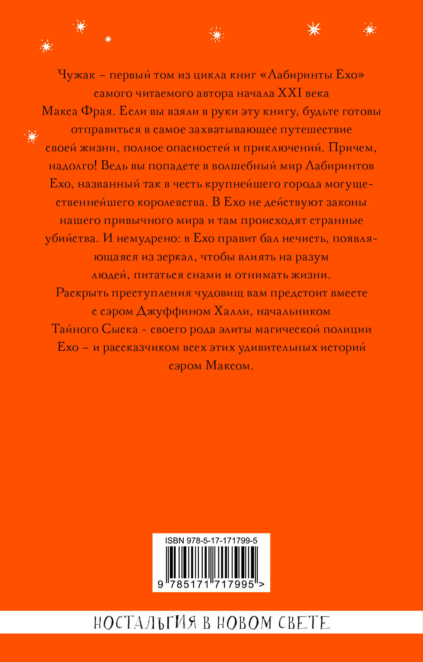 Чужак - первый том из цикла книг "Лабиринты Ехо" самого читаемого автора начала ХХI века Макса Фрая. Если вы взяли в руки эту книгу, будьте готовы отправиться в самое захватывающее путешествие своей жизни, полное опасностей и приключений. Причем, надолго! Ведь вы попадете в волшебный мир Лабиринтов Ехо, названный так в честь крупнейшего города могущественнейшего королевства. В Ехо не действуют законы нашего привычного мира и там происходят странные убийства. И немудрено: в Ехо правит бал нечисть, появляющаяся из зеркал, чтобы влиять на разум людей, питаться снами и отнимать жизни. Раскрыть преступления чудовищ вам предстоит вместе с сэром Джуффином Халли, начальником Тайного Сыска - своего рода элиты магической полиции Ехо - и рассказчиком всех этих удивительных историй сэром Максом.| Издательство | Издательство "АСТ" |