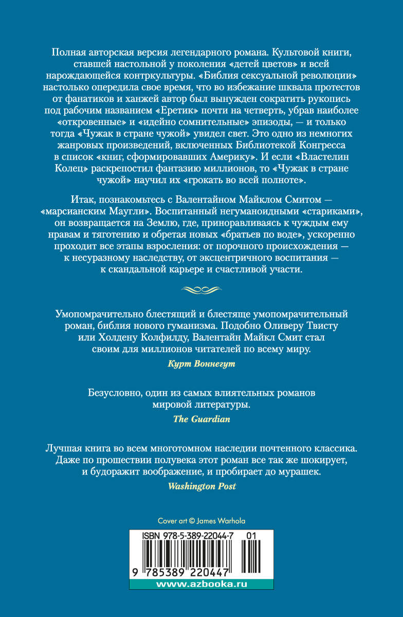 Полная авторская версия легендарного романа. Культовой книги, ставшей настольной у поколения "детей цветов" и всей нарождающейся контркультуры. "Библия сексуальной революции" настолько опередила свое время, что во избежание шквала протестов от фанатиков и ханжей автор был вынужден сократить рукопись под рабочим названием "Еретик" почти на четверть, убрав наиболее "откровенные" и "идейно сомнительные" эпизоды, - и только тогда "Чужак в стране чужой" увидел свет. Это одно из немногих жанровых произведений, включенных Библиотекой Конгресса в список "книг, сформировавших Америку". И если "Властелин Колец" раскрепостил фантазию миллионов, то "Чужак в стране чужой" научил их "грокать во всей полноте". Итак, познакомьтесь с Валентайном Майклом Смитом - "марсианским Маугли". Воспитанный негуманоидными "стариками", он возвращается на Землю, где, приноравливаясь к чуждым ему нравам и тяготению и обретая новых "братьев по воде", ускоренно проходит все этапы взросления: от порочного происхождения - к несуразному наследству, от эксцентричного воспитания - к скандальной карьере и счастливой участи. "Умопомрачительно блестящий и блестяще умопомрачительный роман, библия нового гуманизма. Подобно Оливеру Твисту или Холдену Колфилду, Валентайн Майкл Смит стал своим для миллионов читателей по всему миру" (Курт Воннегут).| Издательство | Издательство АЗБУКА ООО |