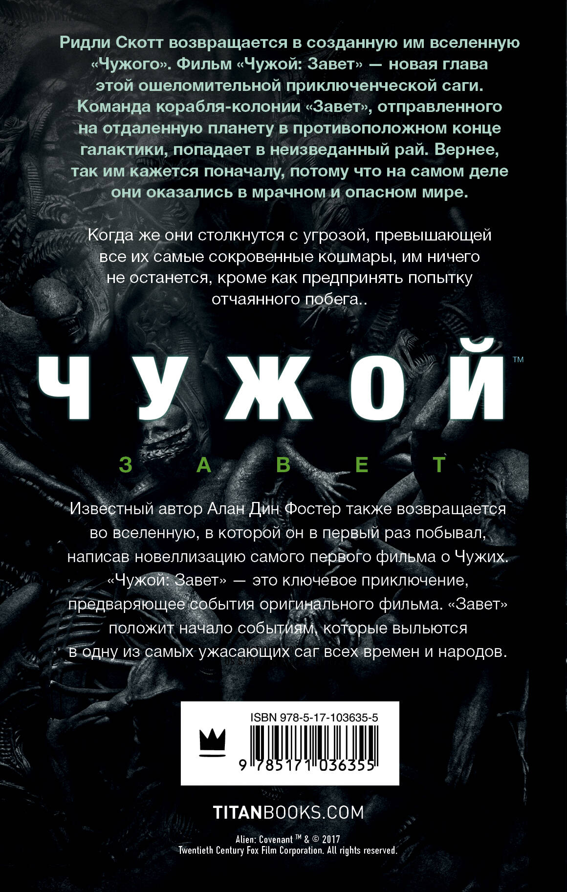 Ридли Скотт возвращается в созданную им вселенную "Чужого". Фильм "Чужой: Завет" - новая глава этой ошеломительной приключенческой саги. Команда корабля-колонии "Завет", отправленного на отдаленную планету в противоположном конце галактики, попадает в неизведанный рай. Вернее, так им кажется поначалу, потому что на самом деле они оказались в мрачном и опасном мире. Когда же они столкнутся с угрозой, превышающей все их самые сокровенные кошмары, им ничего не остается, кроме как предпринять попытку отчаянного побега.| Издательство | ИЗДАТЕЛЬСТВО "АСТ" |