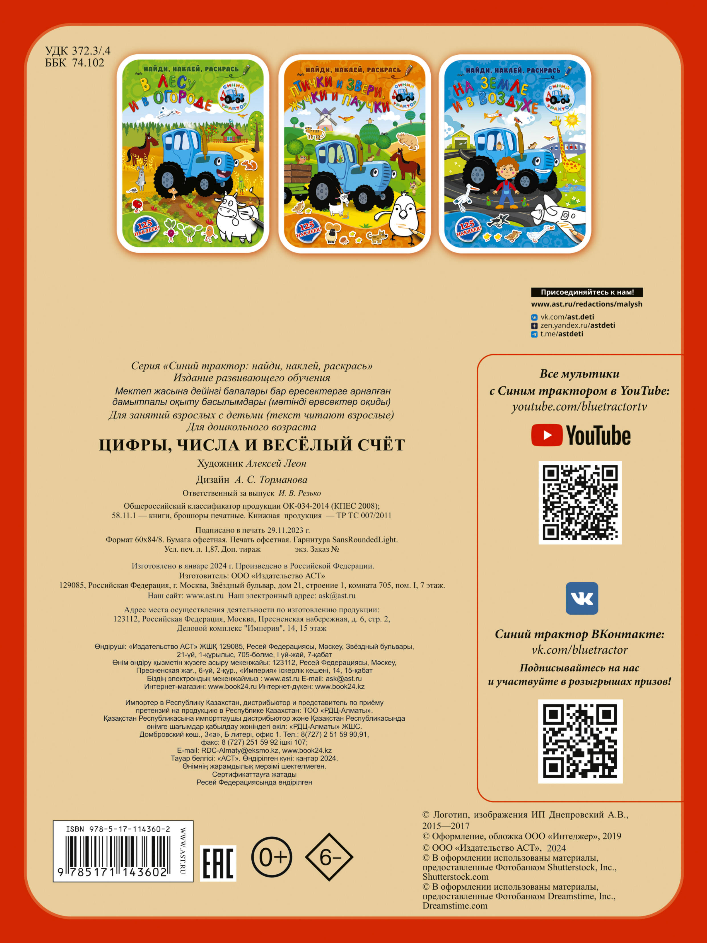 Синий трактор - известный персонаж развивающего мультпроекта, собравшего миллионы просмотров и подписчиков в сети Интернет. На страницах книги "Цифры, числа и весёлый счёт" малыши вместе с героями полюбившихся мультфильмов поиграют с наклейками и, выполняя увлекательные задания, научатся считать. А ещё здесь есть раскраски, которые нравятся абсолютно всем детям. Для дошкольного возраста.