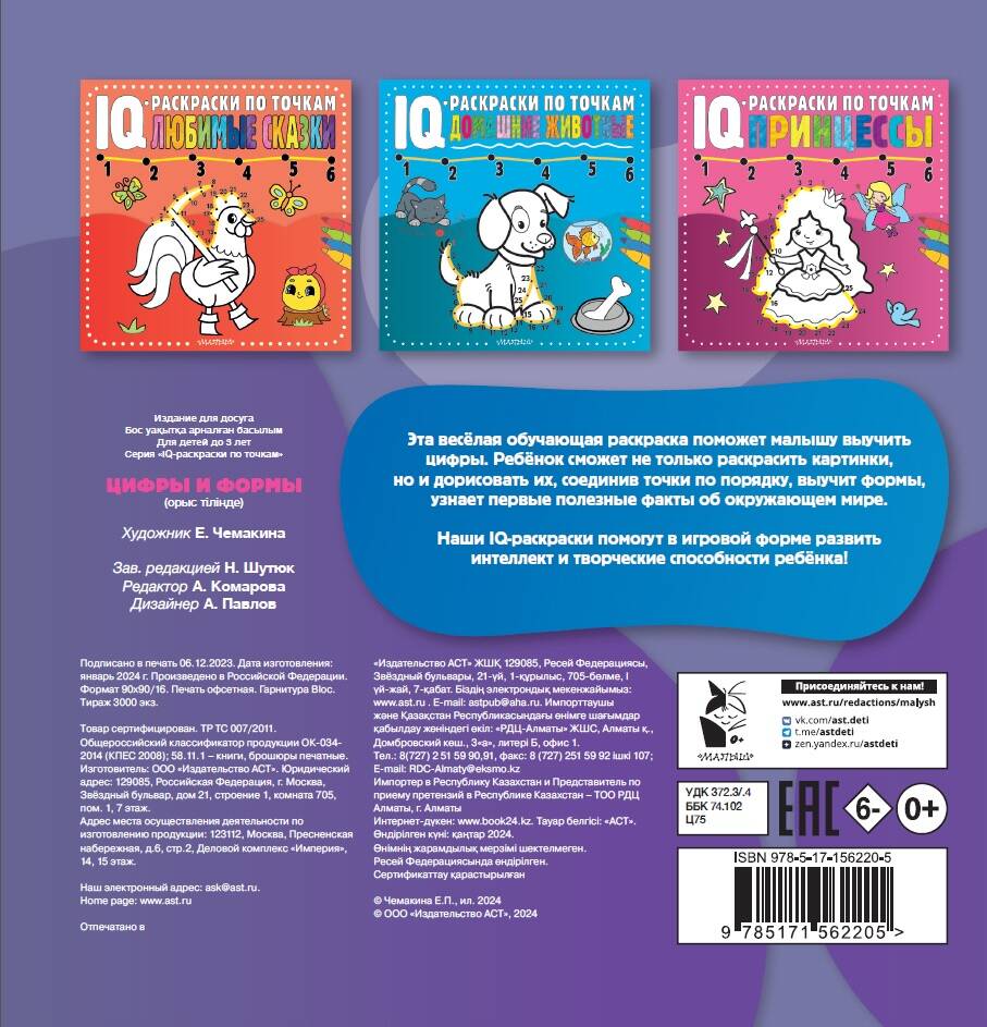 Эта весёлая обучающая раскраска поможет малышу выучить цифры. Ребёнок сможет не только раскрасить картинки, но и дорисовать их, соединив точки по порядку, выучит формы, узнает первые полезные факты об окружающем мире. Наши IQ-раскраски помогут в игровой форме развить интеллект и творческие способности ребёнка!| Издательство | Издательство "АСТ" |