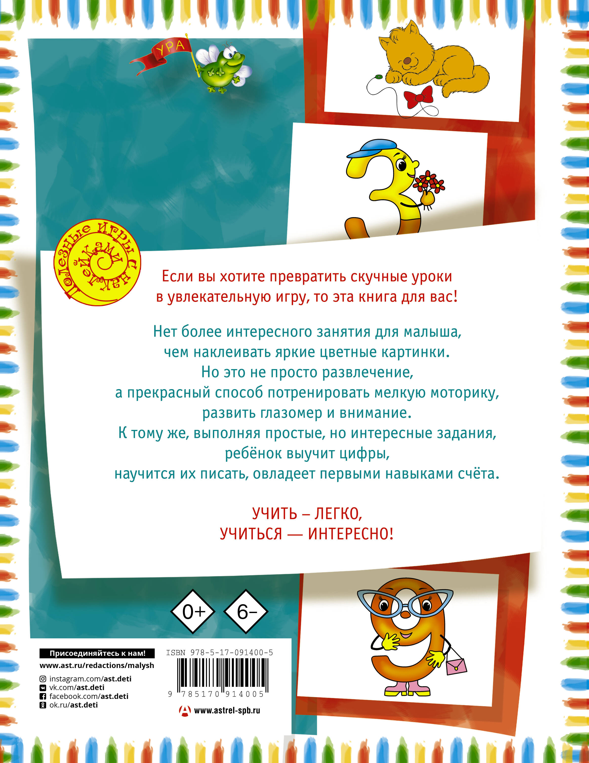 Нет более интересного занятия для малыша, чем наклеивать яркие цветные картинки. Но это не просто развлечение, а прекрасный способ потренировать мелкую моторику, развить глазомер и внимание. К тому же, выполняя простые, но интересные задания, ребёнок выучит цифры, научится их писать, овладеет первыми навыками счёта.| Издательство | ИЗДАТЕЛЬСТВО "АСТ" |