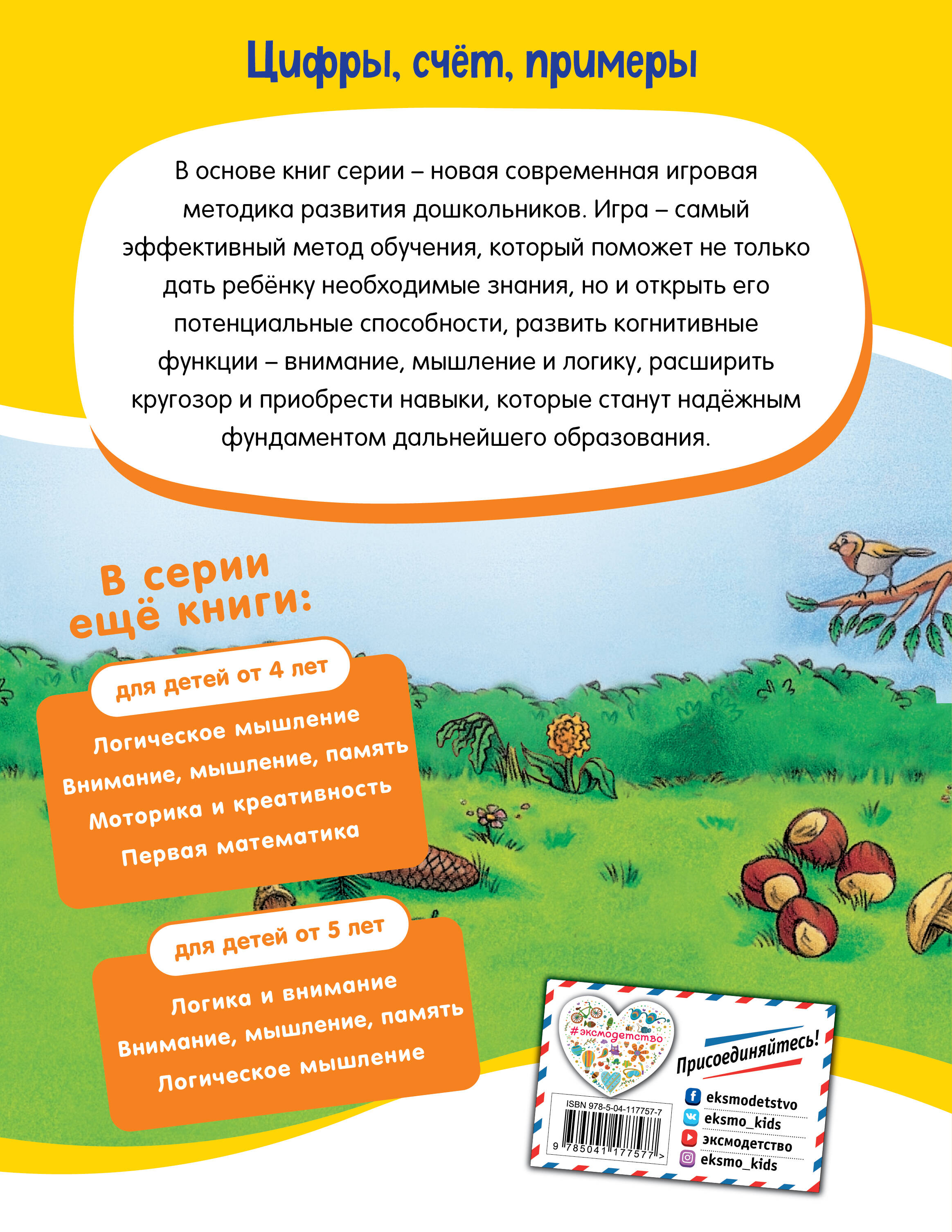 Книга поможет заботливым родителям развить у дошкольника навыки счета и подготовить его к школе по математике. Все упражнения даны в игровой форме, просты, понятны, ориентированы на конкретный возраст и дают ребенку возможность проявить все свои способности. Добрые красочные картинки понравятся ребенку и буду стимулировать его интерес. Главные герои книги енот Полосатик, лисенок Рыжик и их друзья помогут ребенку выполнить увлекательные задания. Вместе с новыми друзьями он повторит цифры и научится их писать; будет сравнивать предметы по размеру и количеству и объединять их в пары, продолжать последовательности и разгадывать судоку; научится складывать и вычитать, опираясь на картинки; узнает много нужного и полезного. Приобретая пособие для своего ребенка, вы поможете ему: • развить навыки счета; • освоить написание цифр; • развить внимание, мышление и другие когнитивные функции; • проявить все свои знания и умения; • развить познавательные способности; • весело и с пользой провести время.| Издательство | ООО "Издательство "Эксмо" |