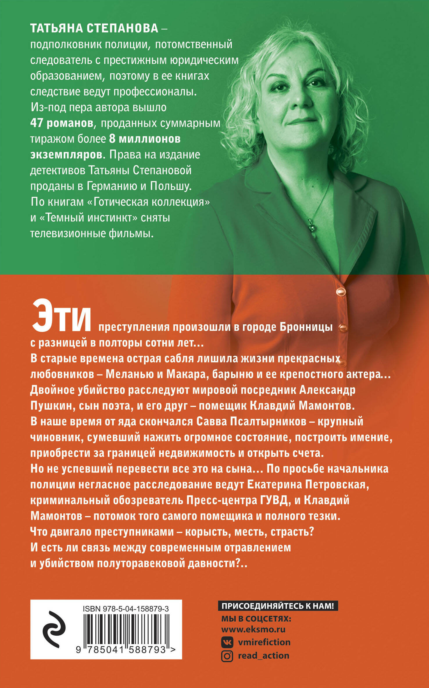 В старые времена острая сабля лишила жизни прекрасных любовников - Меланью и Макара, барыню и ее крепостного актера… Двойное убийство расследует мировой посредник Александр Пушкин, сын поэта, и его друг - помещик Клавдий Мамонтов. В наше время от яда скончался Савва Псалтырников - крупный чиновник, сумевший нажить огромное состояние, построить имение, приобрести за границей недвижимость и открыть счета. И не успевший перевести все это на сына... По просьбе начальника полиции, негласное расследование ведут Екатерина Петровская, криминальный обозреватель Пресс-центра ГУВД, и Клавдий Мамонтов - потомок того самого помещика и полного тезки. Романы потомственного следователя Татьяны Степановой позволяют читателю побывать в литературной «комнате страха». Таинственные убийства, почти осязаемая атмосфера преступления, томительное и тревожное ожидание чего-то неведомого, пугающего... Все это Татьяне Степановой удается воспроизвести просто блестяще.