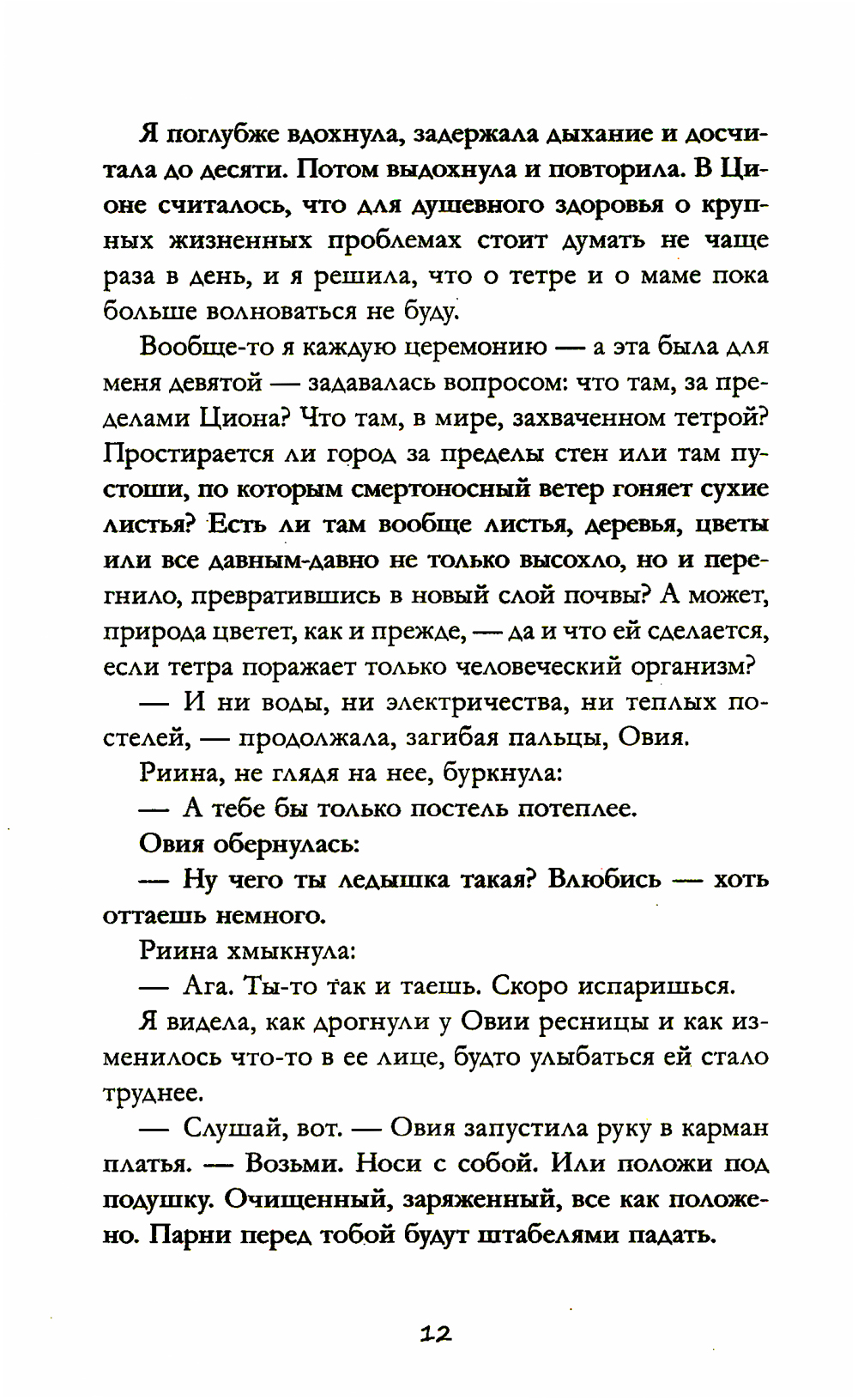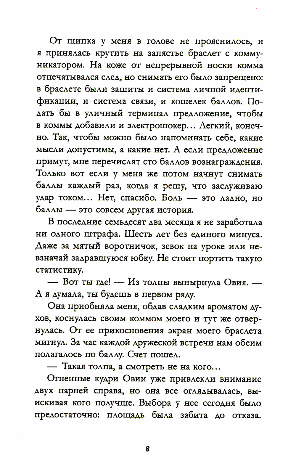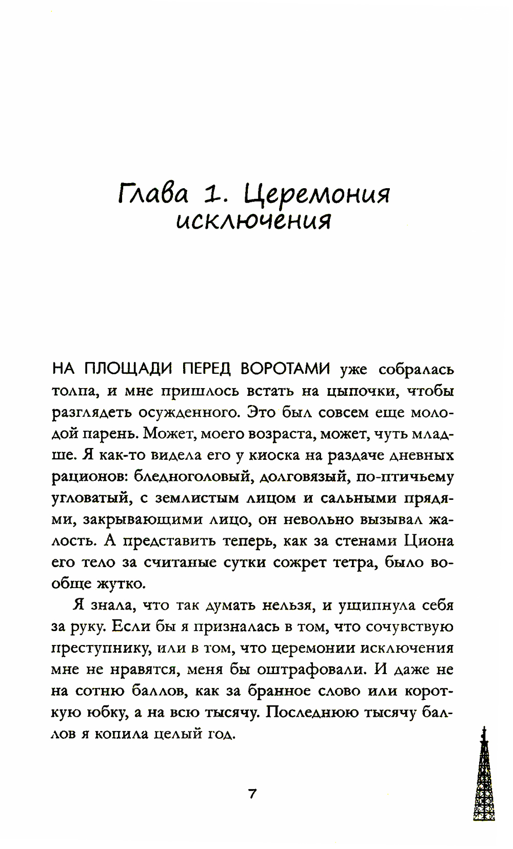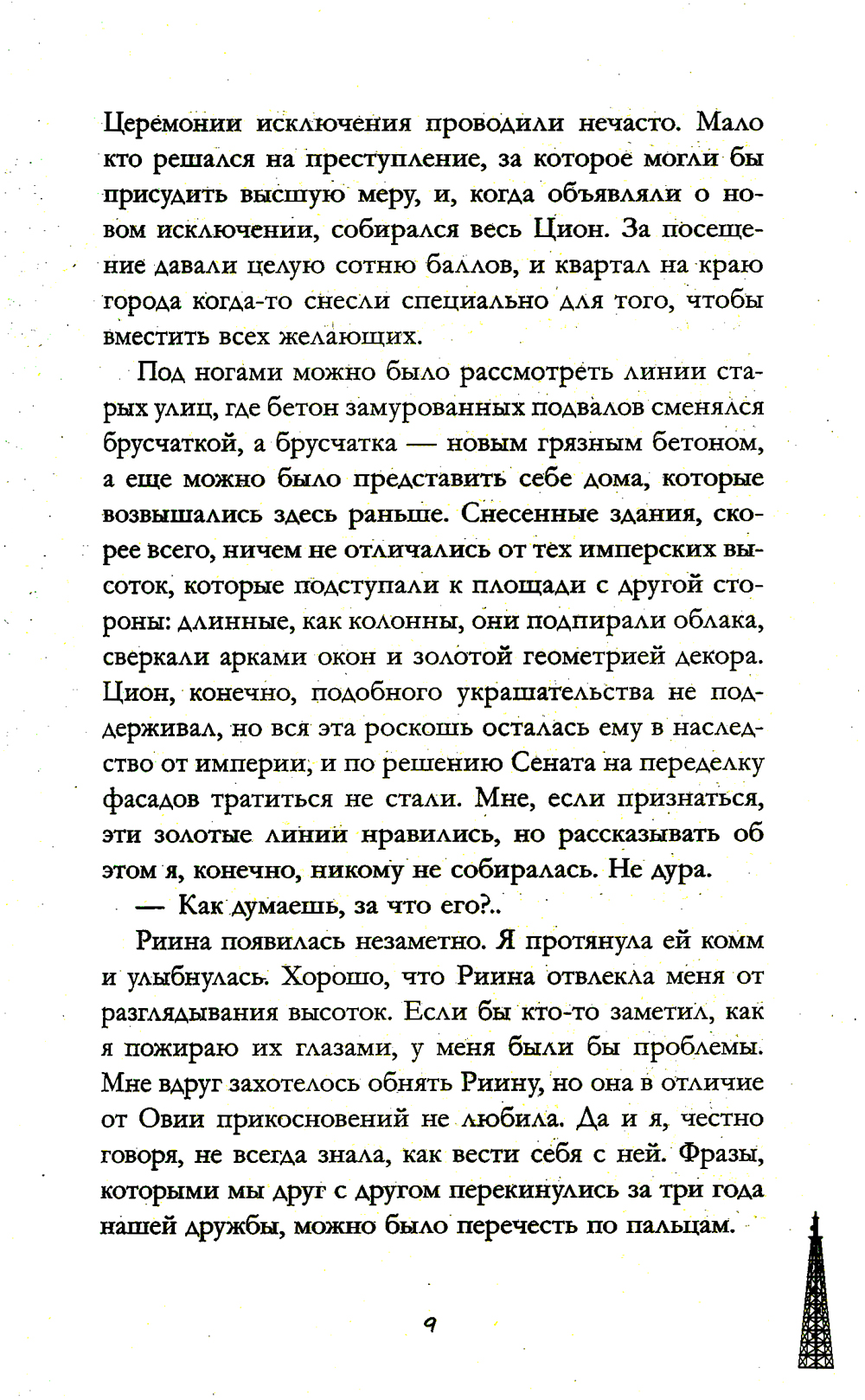Тесса - добропорядочная гражданка Ционо. Она не интересуется, почему город изолирован, а власти следят за каждым жителем. Тесса лишь украдкой любуется его позолоченными высотками - наследием старой империи, о которой все молчат. Тесса мечтает работать на Цион. А Цион вознаграждает преданность. За свои семнадцать лет Тесса накопила столько поощрительных баллов, что скоро весь город будет заклеен плакатами с ее изображением. Но все ломается, когда ее мать умирает при странных обстоятельствах. Тесса начинает терять баллы, а в ее жизни появляется незнакомец, живущий вне законов Циона. Вспыхнувшее чувство ведет Тессу за пределы города. Быть может, Цион - это тюрьма, за стенами которой скрываются настоящие жизнь и любовь?| Издательство | Клевер-Медиа-Групп |