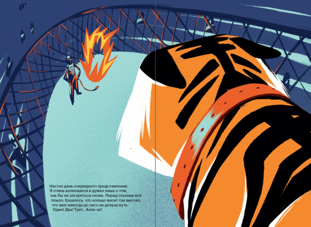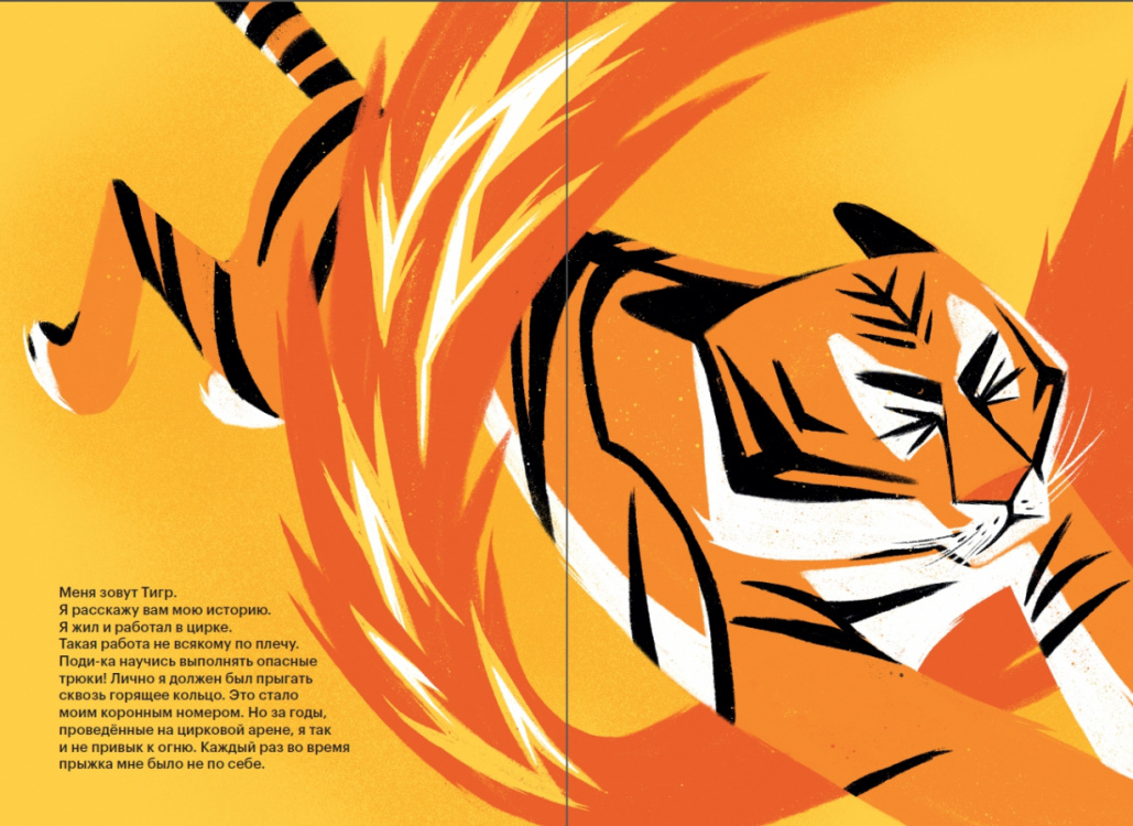 Эта книга, основанная на реальной истории тигра из Канады, рассказана от лица самого животного. Когда тигр пострадал во время трюка с прыжком в огненное кольцо, дрессировщики заставляли его продолжать выступать, несмотря на травму. Но добрые люди заступились за тигра, и он оказался на свободе, в заповеднике.