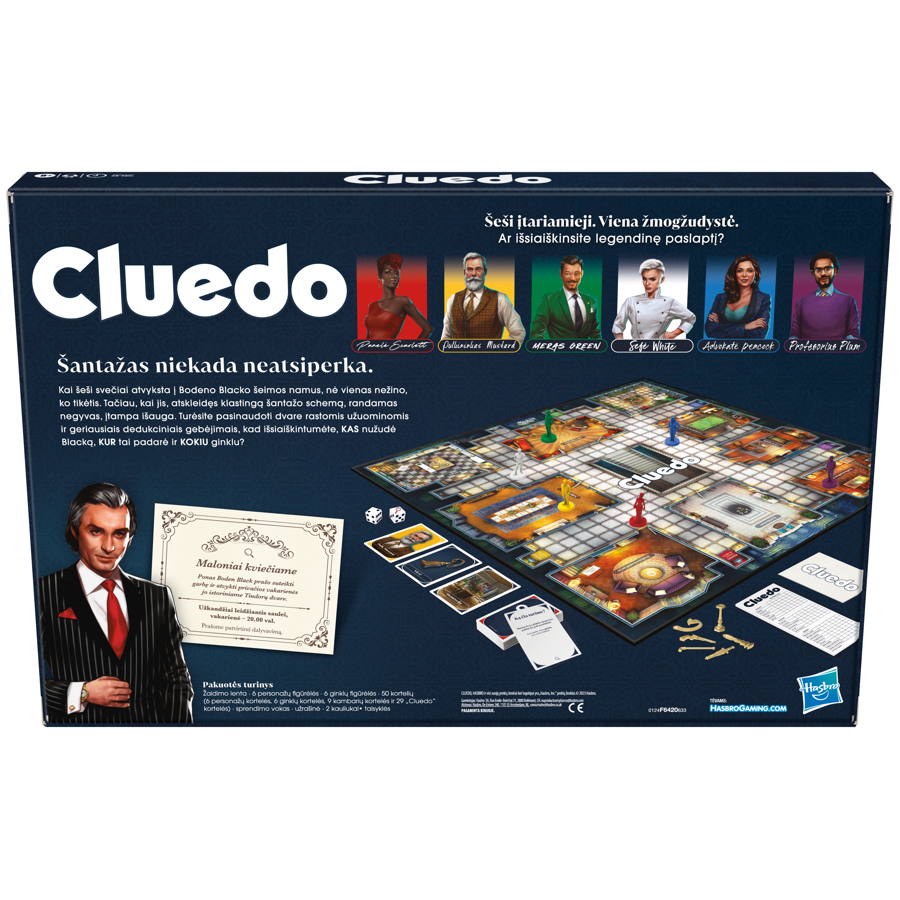 Кто убил Бодди Блэка? Разгадайте тайну этой напряженной настольной игры Clue! Когда шесть гостей прибывают в особняк Бодена Блэка, никто из них не знает, чего ожидать. Но когда их хозяин оказывается мертв после того, как раскрыл зловещую схему шантажа, все становится на свои места. Наперегонки с другими игроками расследуйте дело, собирая улики и сужая круг вариантов. Каждый игрок отслеживает свои подсказки в блокноте детектива и исключает информацию, чтобы выяснить, кто убил мистера Блэка, где в особняке они это сделали и какое оружие использовали. Бросили значок увеличительного стекла? Вытяните карту "Разгадка", чтобы добавить интриги! Игрок может открыть новый тайный ход или назвать оружие, которое он хочет раскрыть. Будьте первым, кто выдвинет правильное обвинение, и выиграйте игру! Игра на литовском языке.