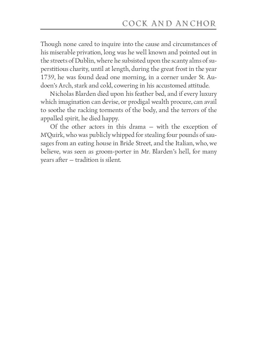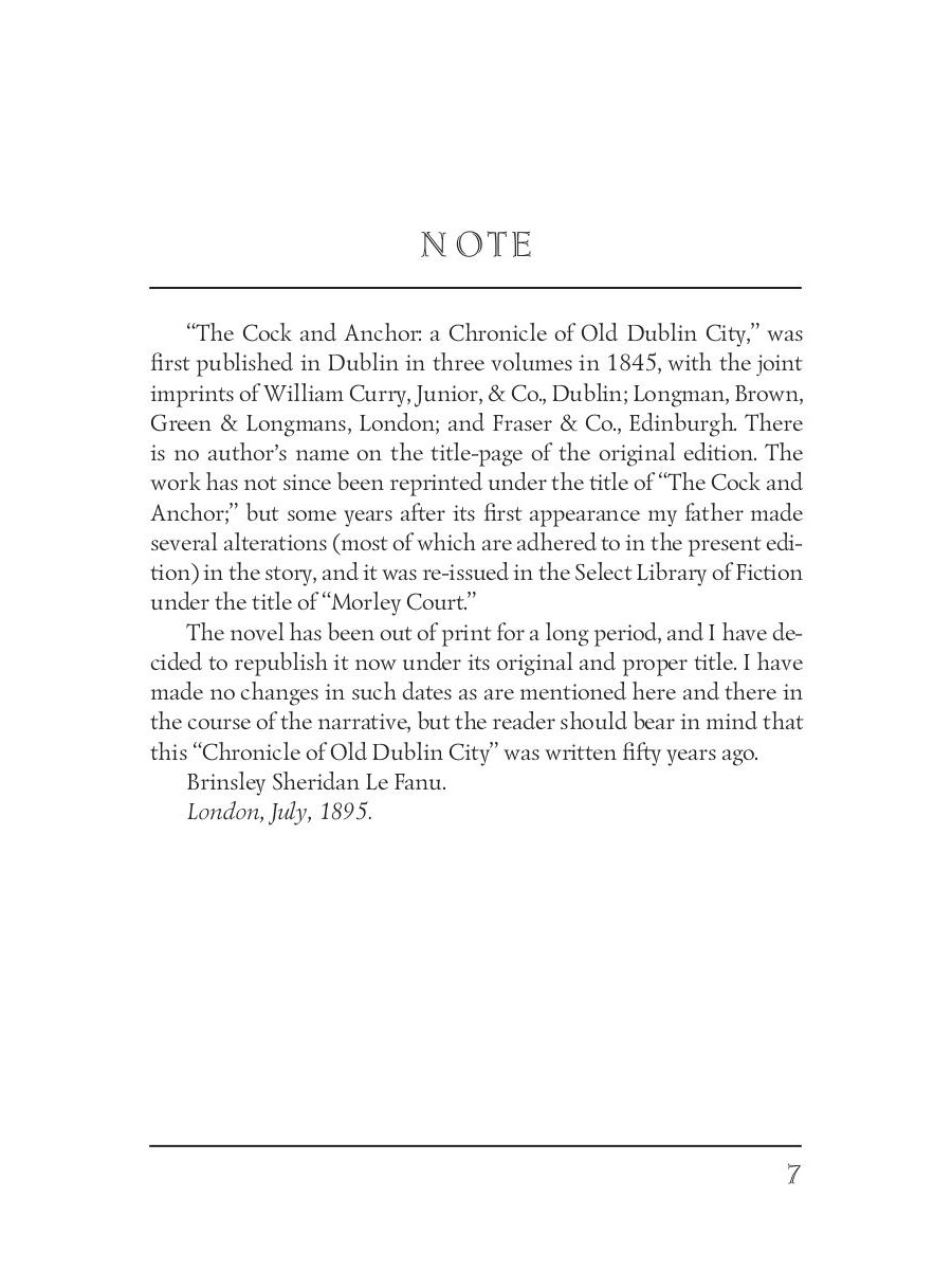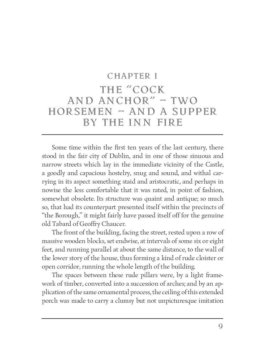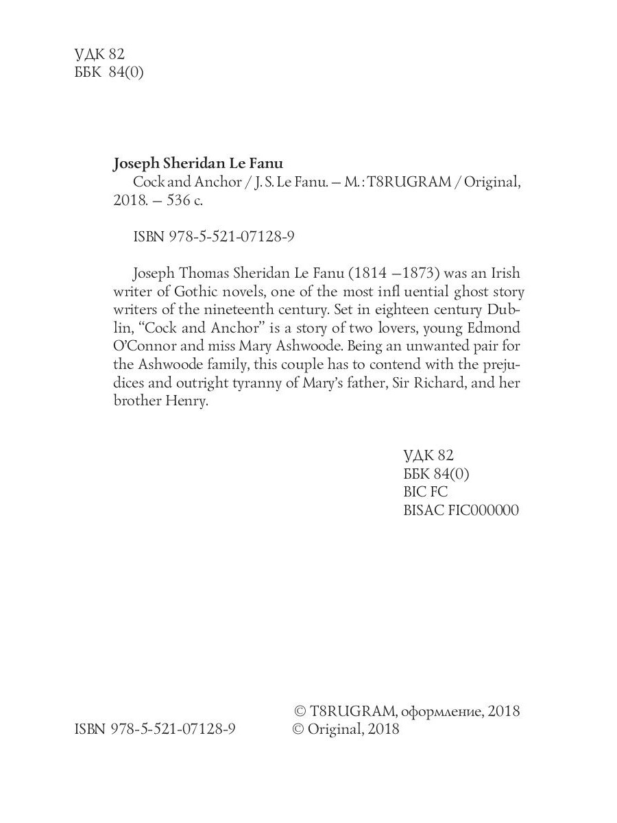 Joseph Thomas Sheridan Le Fanu (1814-1873) was an Irish writer of Gothic novels, one of the most infl uential ghost story writers of the nineteenth century. Set in eighteen century Dublin, "Cock and Anchor" is a story of two lovers, young Edmond O'Connor and miss Mary Ashwoode. Being an unwanted pair for the Ashwoode family, this couple has to contend with the prejudices and outright tyranny of Mary's father, Sir Richard, and her brother Henry.