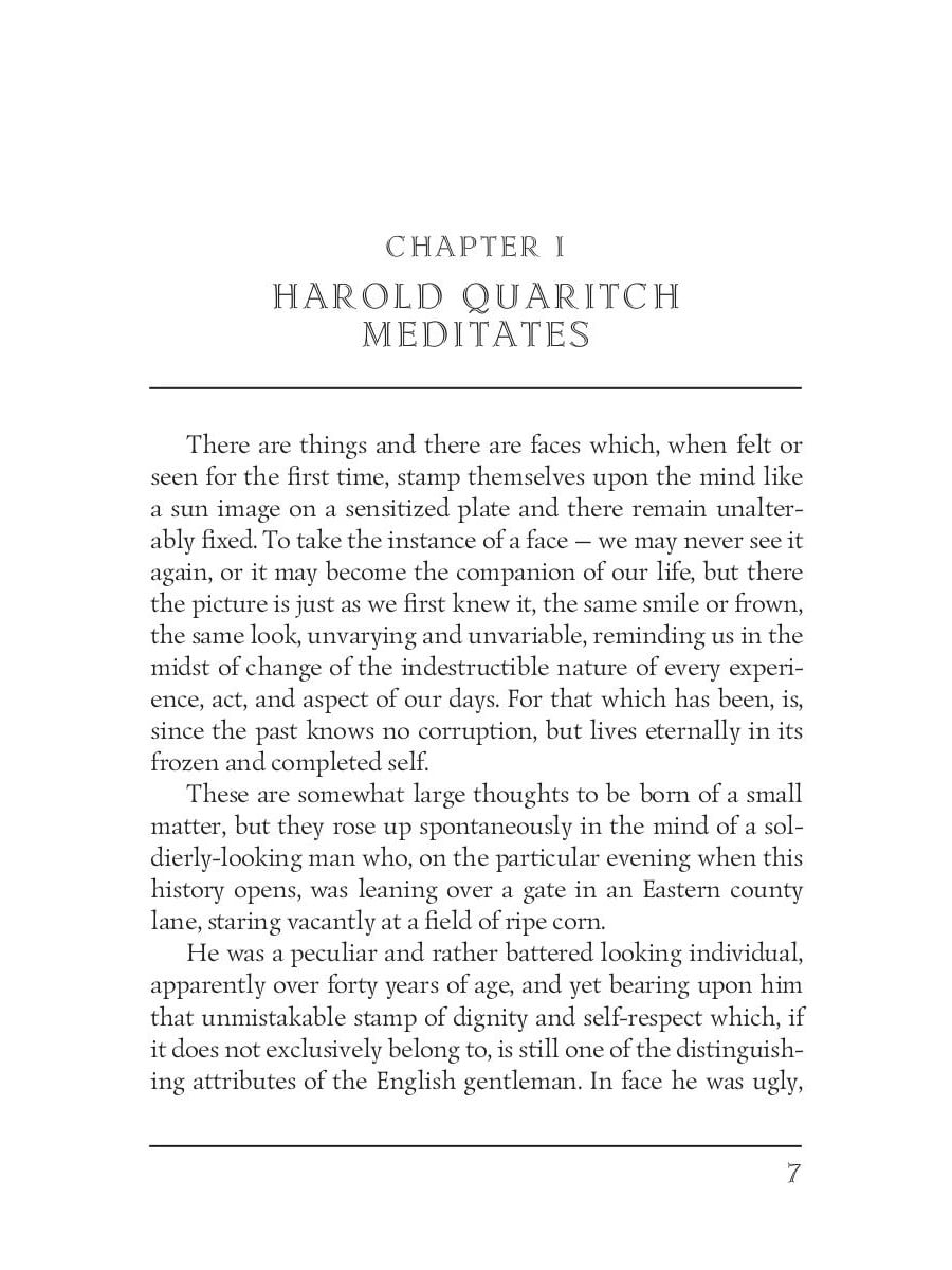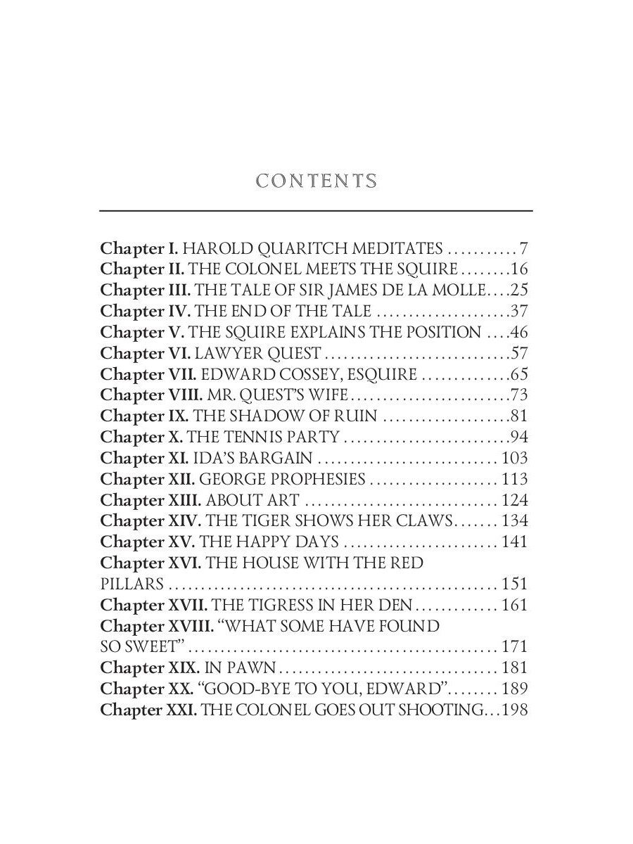 Colonel Quaritch is an impoverished nobleman, who is looking for the family jewels of his bride - the "treasure de la Moley". He moves to the house of his late aunt in the village of Honhem and soon becomes involved in an adventure.