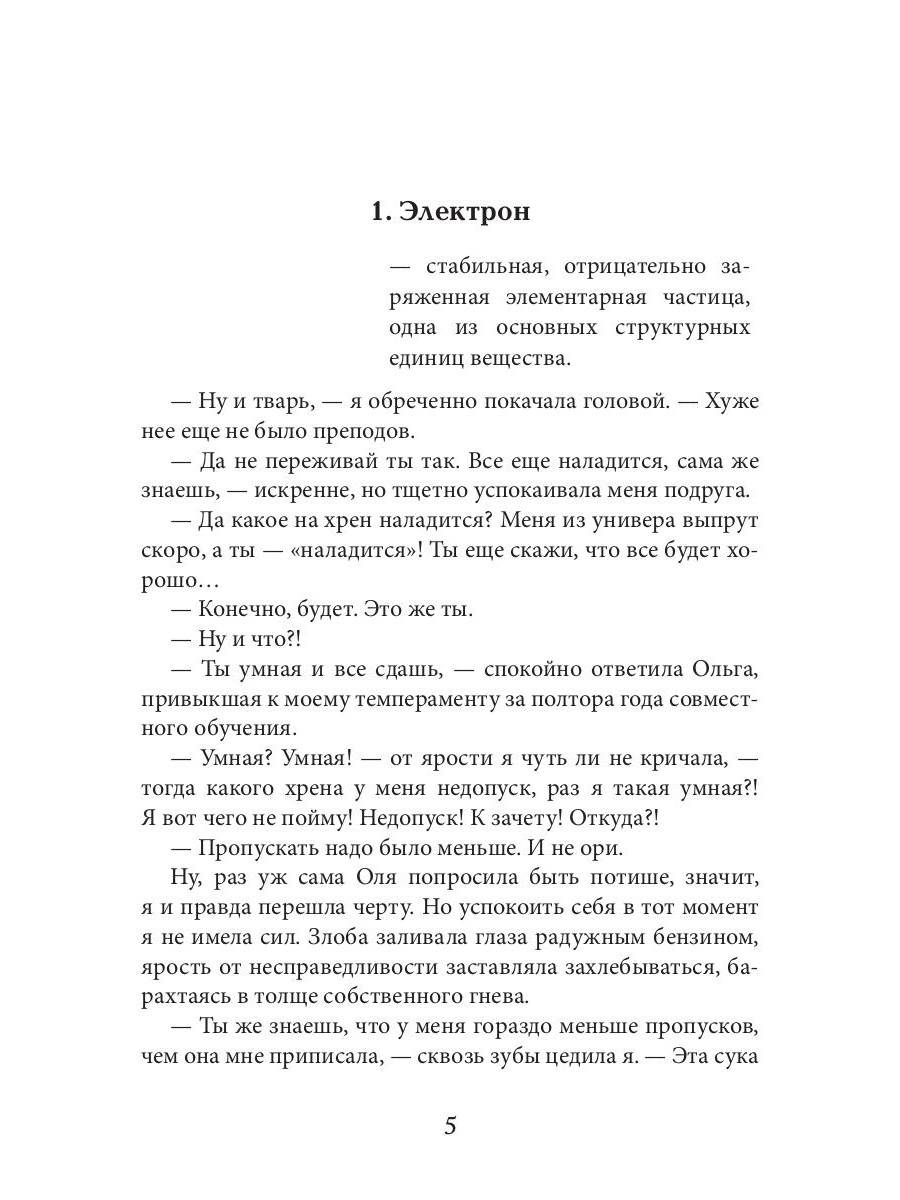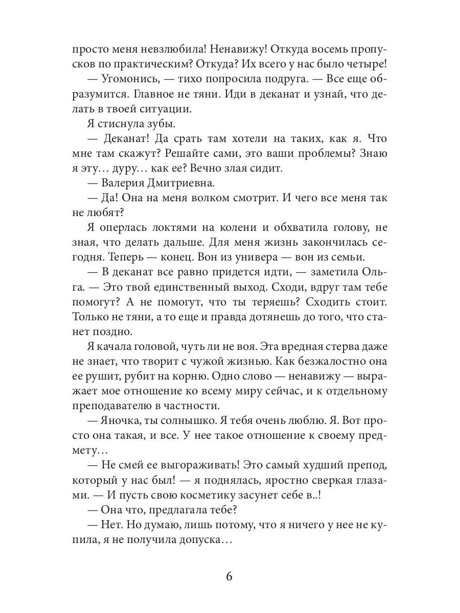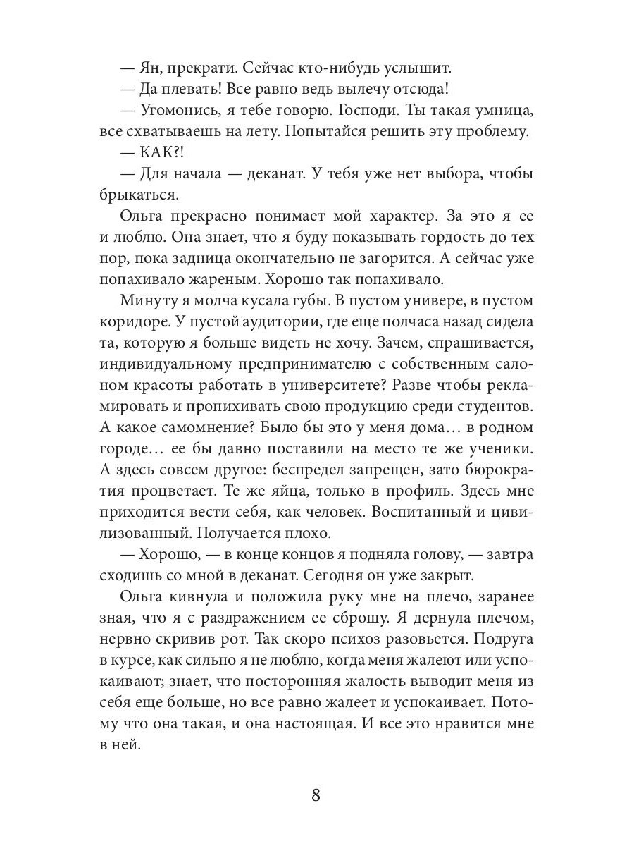 В жизни Яны Гарзач наступает черная полоса. Конфликты в институте, недопонимание в семье, финансовые трудности и комплексы усугубляют ее проблемы с самоконтролем, порождая спонтанные и опасные вспышки ярости. Последней каплей становится чреватый исключением недопуск к экзамену. Но внезапно Яне начинает помогать странный преподаватель с другого факультета. Ненавязчиво решая одну проблему за другой, он ничего не просит взамен, однако его необъяснимый интерес не остается без внимания. Герои оказываются в щекотливом положении, пытаясь пресечь похабные сплетни о себе.| Издательство | Т8 RUGRAM |