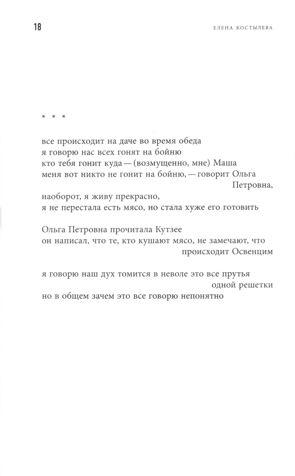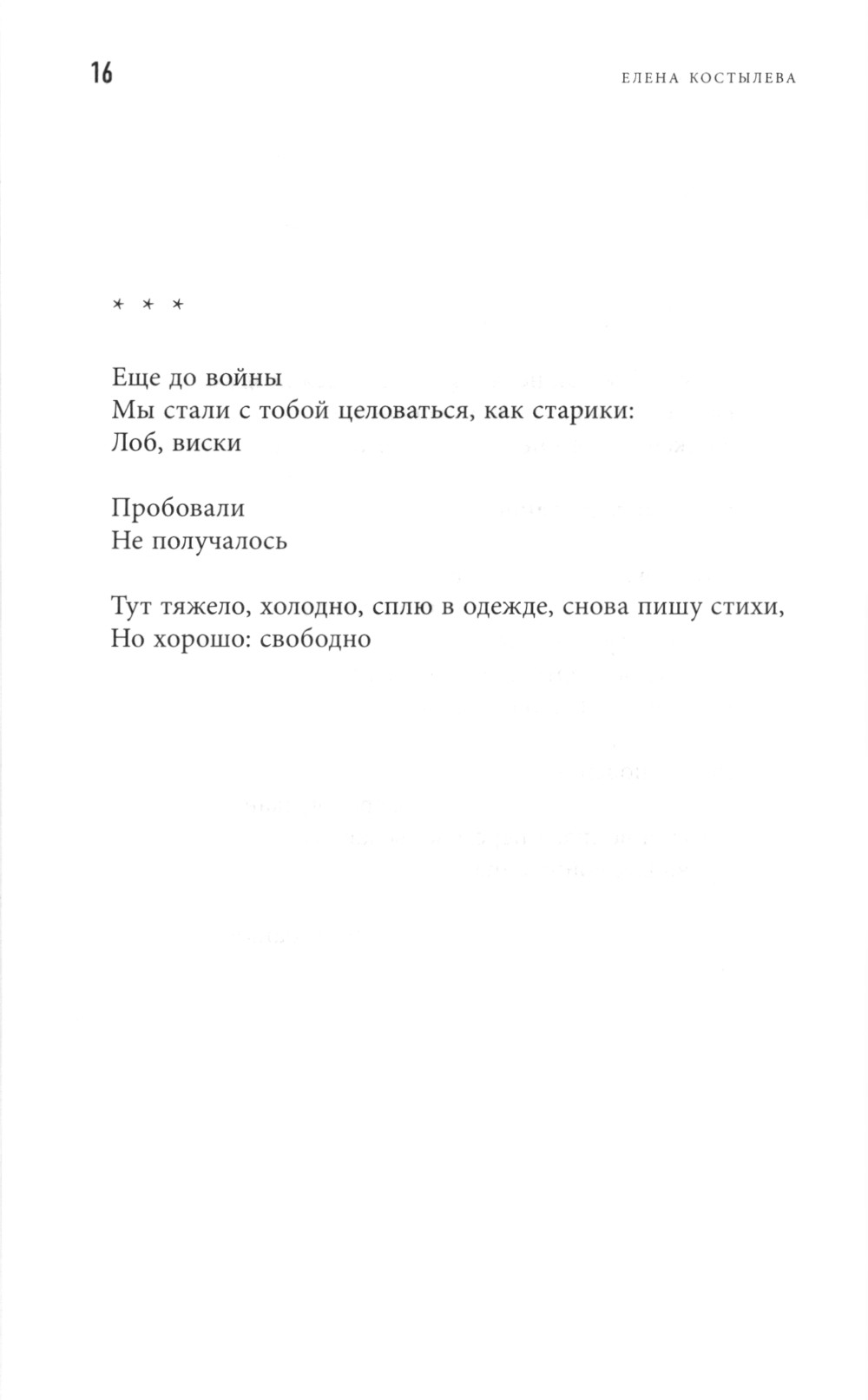 Сопротивляясь концептуалистскому выхолащиванию чувственного, практикуя то, что Сьюзен Сонтаг называла - в противовес интерпретации - эротикой искусства, тексты Костылевой вместе с тем создают ситуации чрезвычайного положения, эксплицируя иерархическую природу всякого дискурса, проблематику социализации женщины и насилия письма над поэтом. Елена Костылева - автор книг «Легко досталось» (Colonna Publications, 2000), «Лидия» (Colonna Publications, 2009), «День» (Порядок слов, 2019). Стихи, статьи и рецензии печатались в журналах «Вавилон», «Митин журнал», «Новое литературное обозрение», «Сеанс», «Логос», в десятках популярных изданий. Книги входили в шорт-листы Всероссийской премии «Дебют» (2000) и Премии Андрея Белого (2009). Стихотворения Е. Костылевой переведены на английский, французский, итальянский, греческий, китайский языки, включены в несколько антологий. Живет в Санкт-Петербурге.